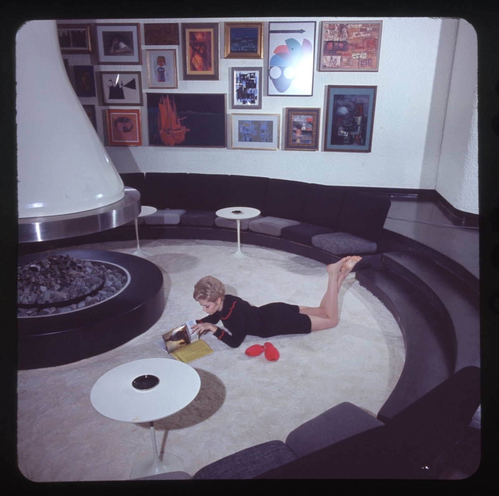 "Colorful textiles and artworks from Mexico and South America... gave the space a decidedly mod vibe," wrote Dallas Morning News architecture critic Mark Lamster in 2014. "Even the walls were sexy, being made of a sprayed concrete... left in a deliberately rough state but with a slick plastic coating. Their curvy profiles were set off dramatically by black travertine floors."