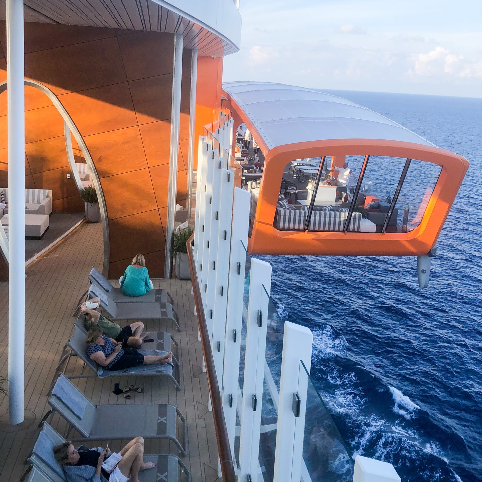 There's also the Magic Carpet, a cantilevered platform that slides up and down the side of the ship, doubling as a dining venue and a chic lounge for cruisers waiting to tender to shore.