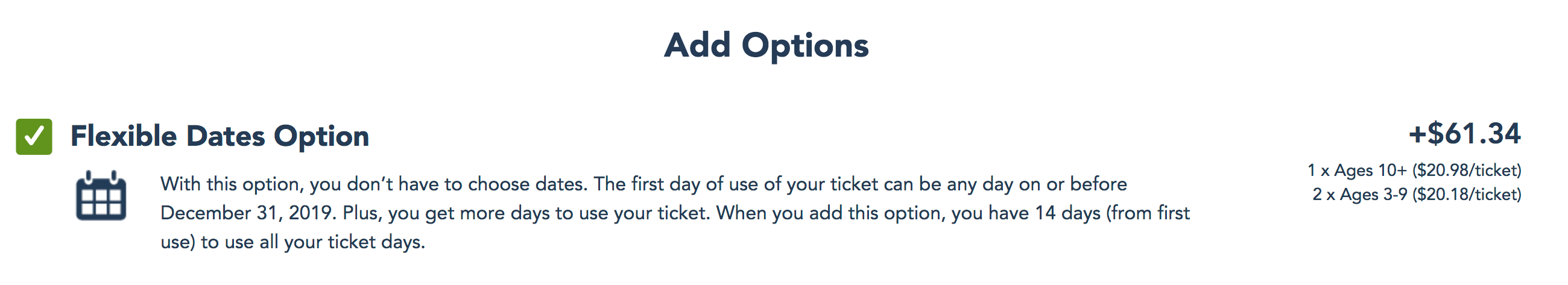 At checkout, you can pay extra to make your tickets valid on any date through December 31, 2019. This option also provides you the added benefit of conferring 14 days to use all dates of the multiday ticket, just as was the case with all multiday tickets until today.