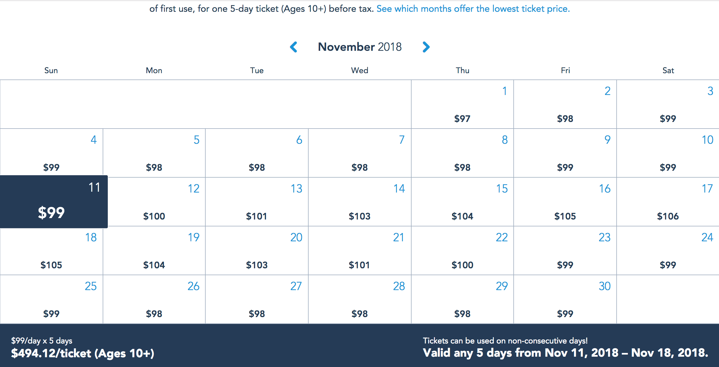 This is the dawn of the era when you purchase Disney World multiday tickets based on the dates you want to visit the parks. Some very off-peak days now cost a few dollars less, some cost about the same and expect to pay more for peak season dates. To give a flavor of pricing changes, two-day tickets range from $101 to $119 per day, when the old price was $105 per day. You can check out Disney World prices online through mid-December 2019.