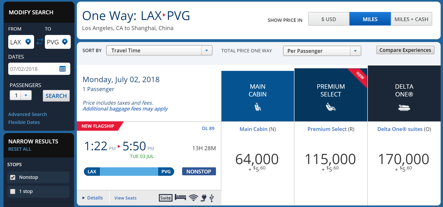 Delta is replacing its Boeing 777-200LR currently running between LAX-PVG with one of its new Airbus A350-900XWB. Flights between the two cities will utilize the A350 on alternating dates from July 2-18 before becoming daily starting July 18. This schedule is obvious when searching Delta's website for Premium Select awards in July: