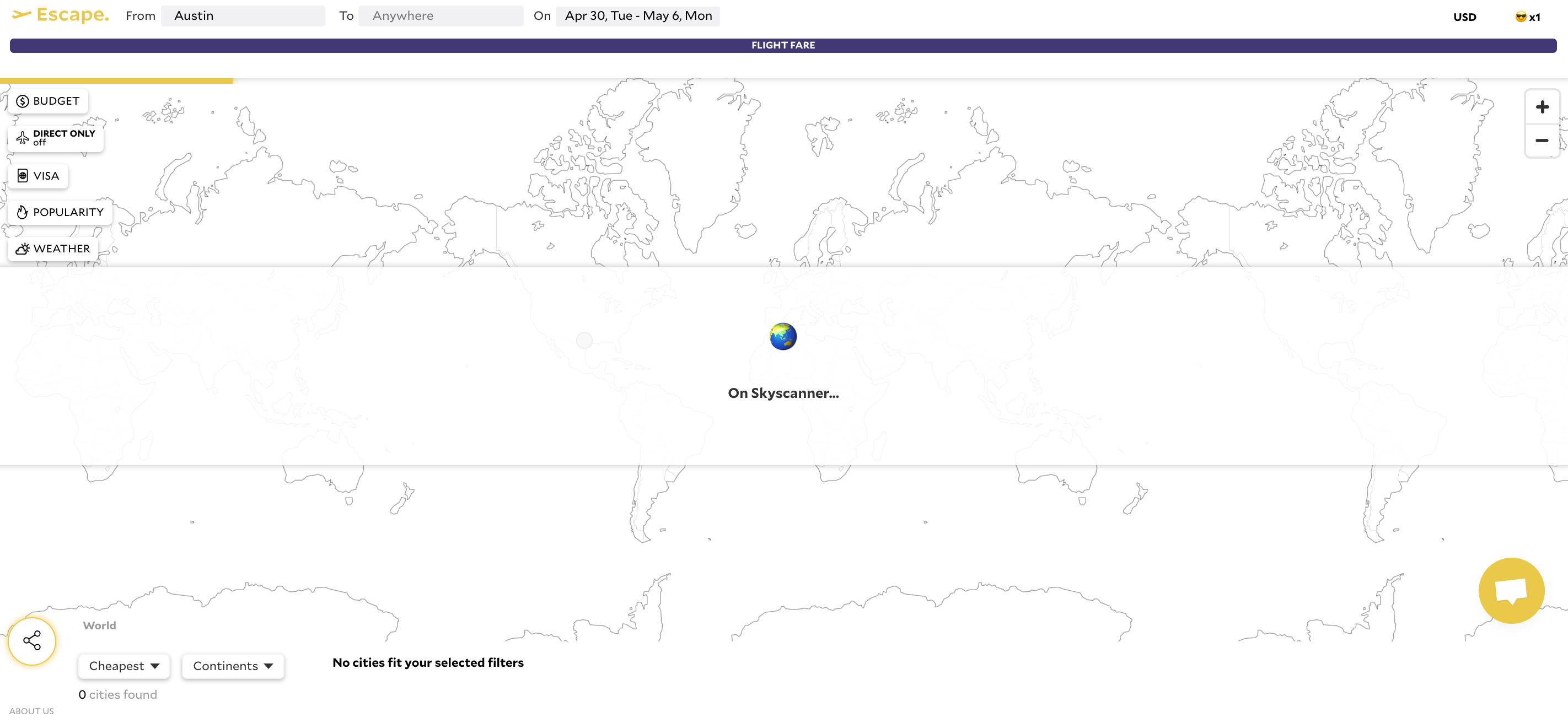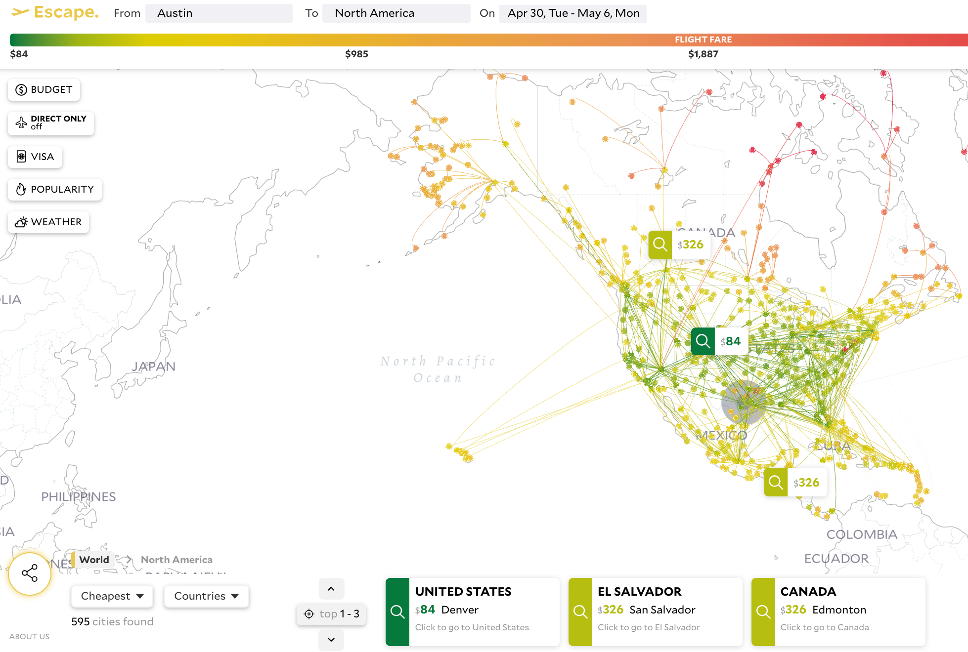 Once your search results are complete, the previously blank world map becomes a beautiful color gradient of available routes that can be filtered by budget, direct-only, visa-required, popularity and weather filters to the left of the page.