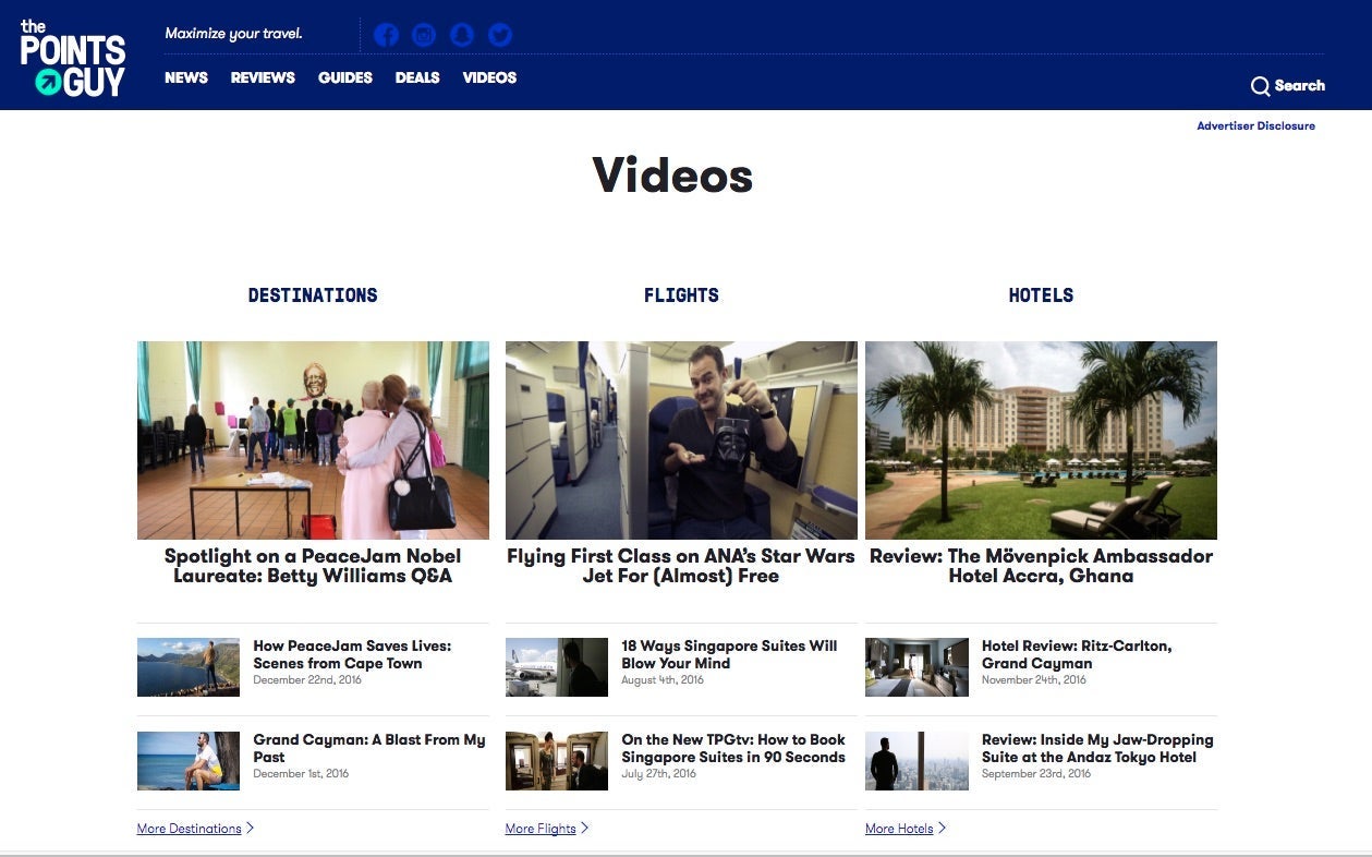 Our Guides page showcases the latest how-to articles and round-ups, including stories like the Best Airlines for Families, Top Business Credit Cards for 2017 and our Points and Miles Guides to cities like New York, London, Paris, Buenos Aires and Puerto Rico. We've made sharing infinitely easier by adding Facebook and Twitter share buttons to the tops and bottoms of all articles and by offering Pinterest buttons on the top left of all images.