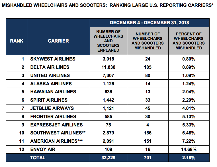 Last year the DOT started requiring airlines to keep track of mishandled wheelchairs and scooters, and the first set of data from December 2018 has been revealed in the February 2019 Air Travel Consumer Report.