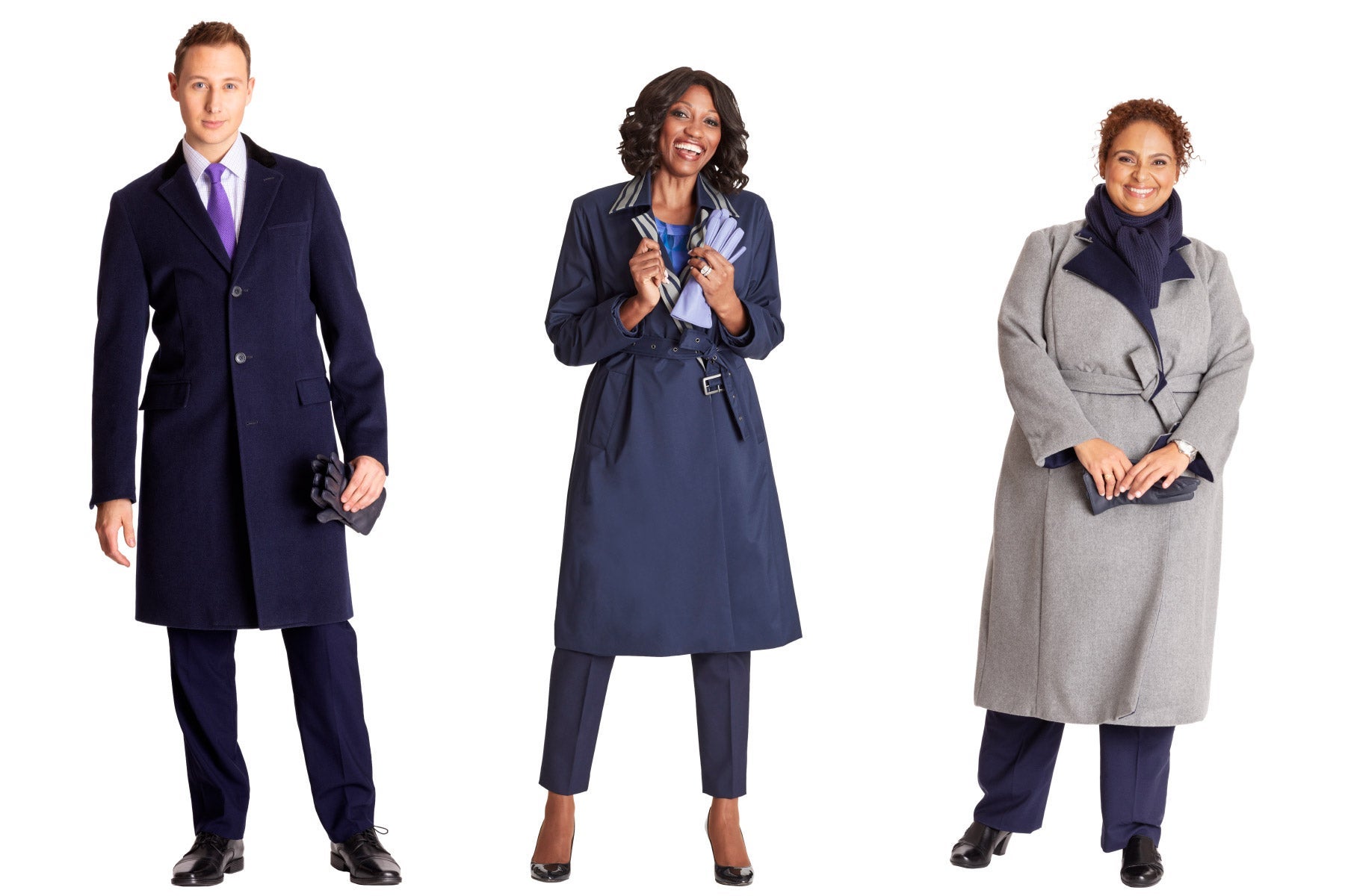 And here are some of the crew garments. While I'd never claim to be any sort of expert when it comes to fashion, I do like the outerwear. The male flight attendant overcoat matches the Brooks Brothers aesthetic and the female items look fashionable enough.
