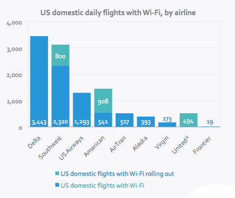 Meanwhile, Virgin America and AirTran have 100% of their domestic flights equipped with WiFi.