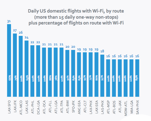 While in general you are more likely to get WiFi on longer flights, those between LAX and SFO are well connected due to the influence of Virgin America and Southwest, with 31 flights a day and 66% of the total on that route being enabled. LAX to JFK and Atlanta to Orlando - thanks to Delta - come in close second and third.