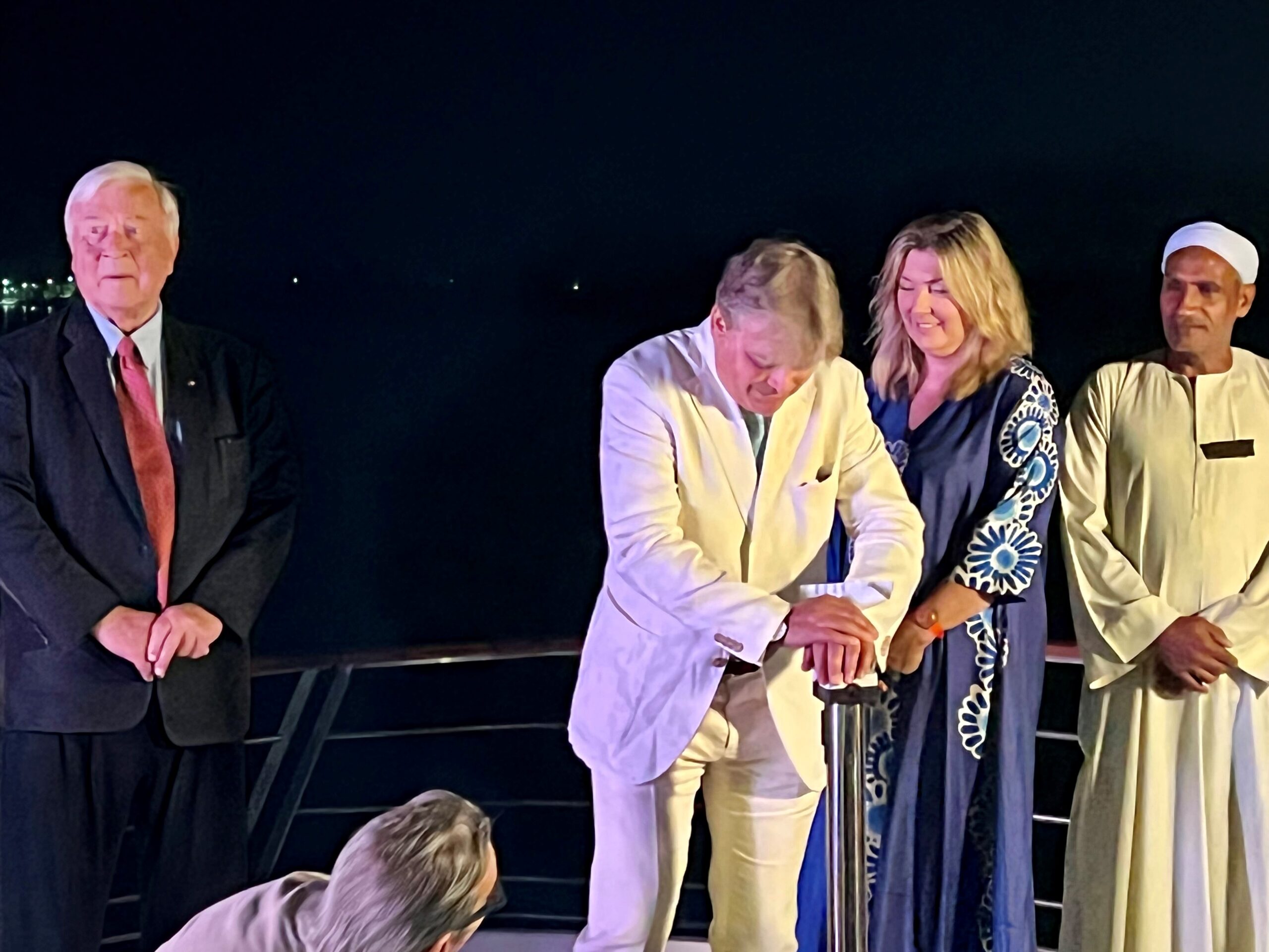 The naming ceremony included an official bottle-breaking against the hull of the vessel, triggered by a guest of honor with an unusual tie both to the historic temples of Egypt that the ship will visit and Viking itself: George Herbert, the 8th Earl of Carnarvon. The English lord's great-grandfather, also named George Herbert and the 5th Earl of Carnarvon, was the famous Egyptologist Howard Carter's benefactor and co-explorer. Together they discovered the tomb of King Tutankhamun nearly 100 years ago.