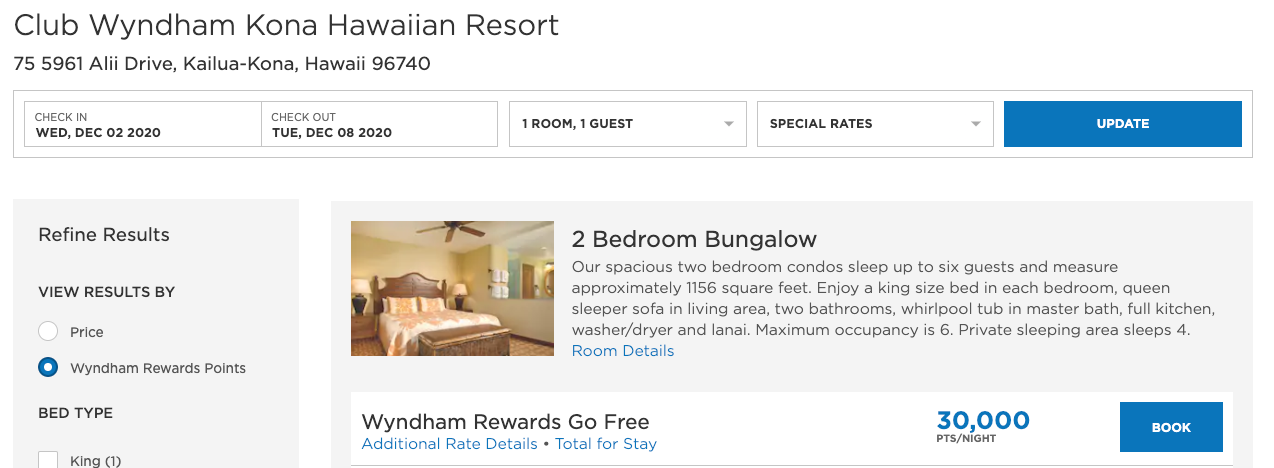 Next, there are some excellent Wyndham properties around the world that shouldn't be overlooked. Whether you want to go to Hawaii, Thailand, Europe or Latin America, Wyndham properties available for booking with points. Club Wyndham resorts can be great for families with larger rooms and suites available for points bookings. The Club Wyndham Kona Hawaiian Resort offers two-bedroom condos on the big island for 30,000 points per night.