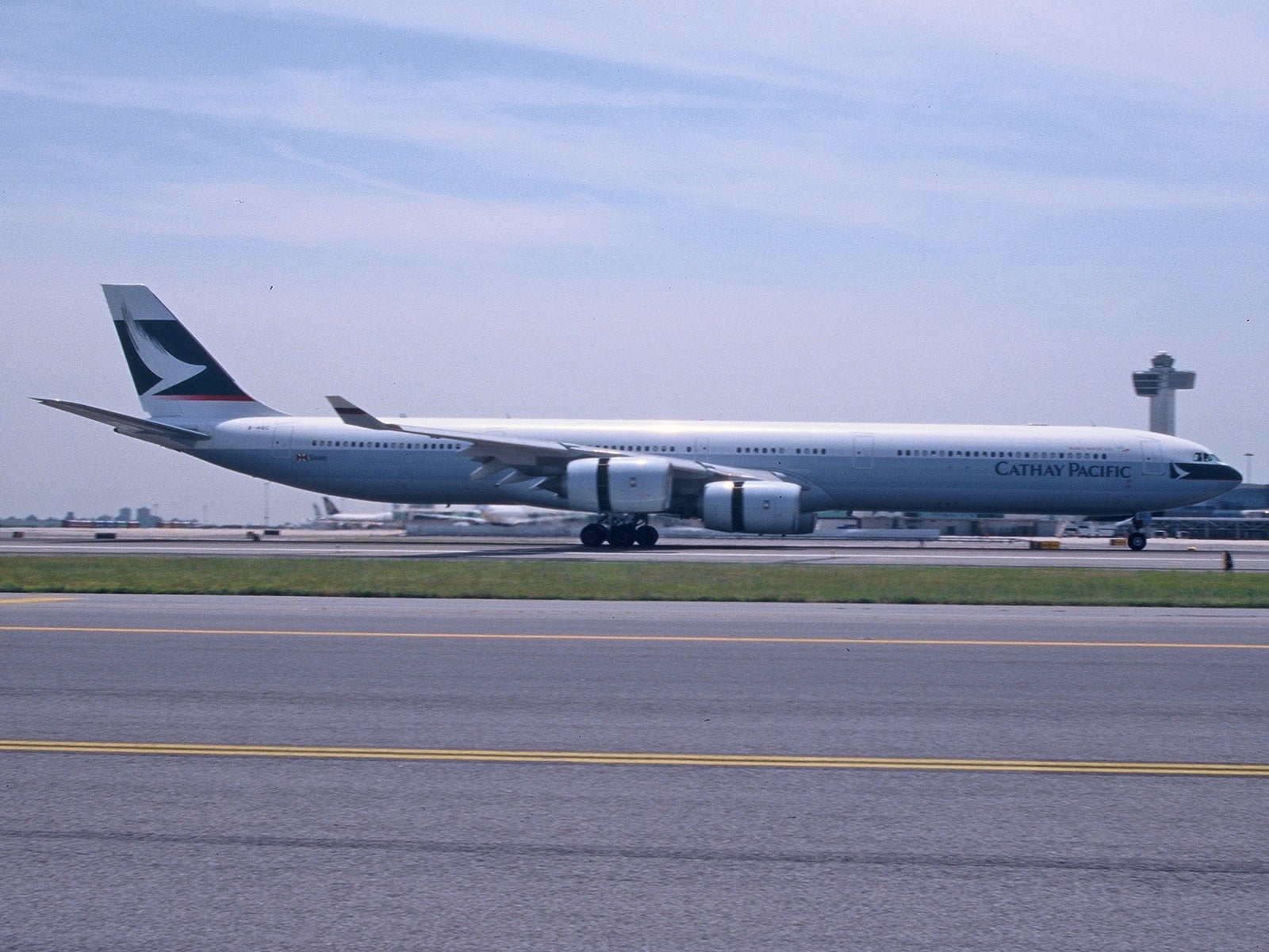 Cathay Pacific also flew Airbus A340s to JFK — the bigger A340-600 variant, at the time the biggest Airbus ever made and also the longest airplane in the world at a whopping 247 feet. It would fly nonstop from Hong Kong, a route on which it has been superseded by the far more economical Boeing 777, which carries the same number of passengers but with two fewer engines. Those elegant A340-600s are a rare breed now, but can still be seen every day at JFK in the colors of Virgin Atlantic and South African Airways.