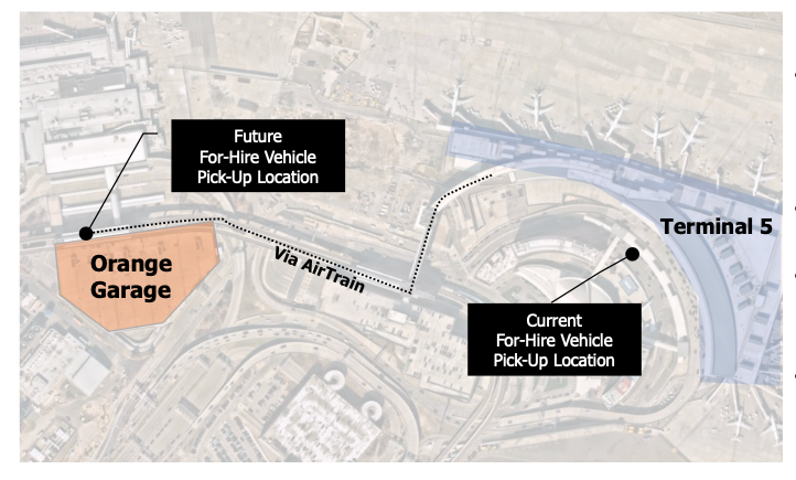 Ubers and Lyfts will only be allowed to pick up Terminal 5 passengers at a new staging area being built on the roof of the Orange Garage, which is adjacent to Terminal 7.