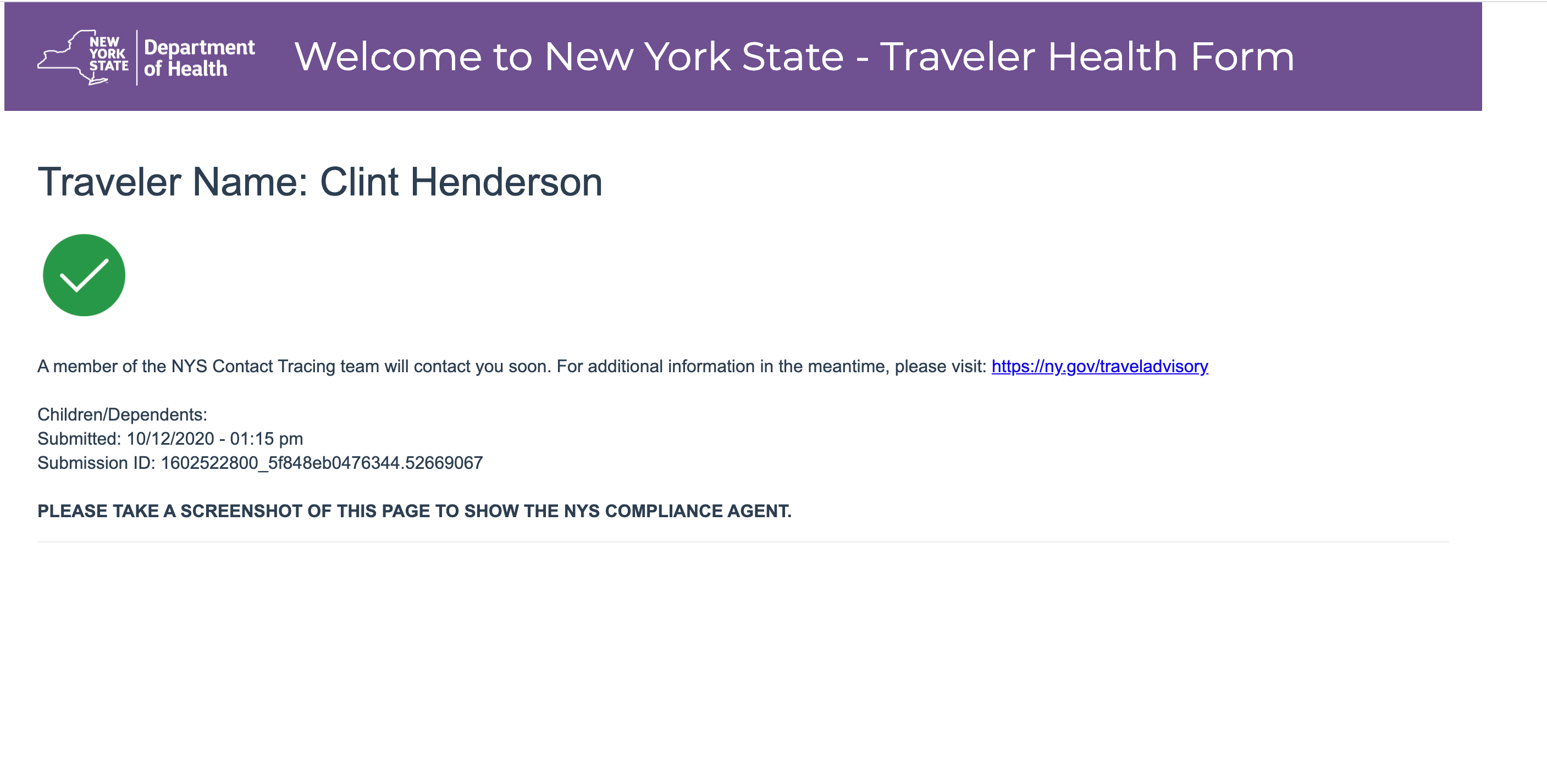 The good news is that arriving passengers are also able to notify the state of their quarantine online. That's what I ended up doing. Once I filled out the online form, I received the notification below and was asked to screenshot it for the state (no one ever asked to see it). It says that you are to show it to a compliance agent, but I assume that is if you've filled it out beforehand and are arriving in New York.