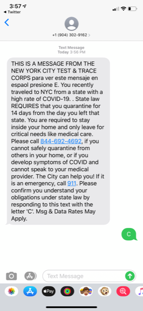 The day after I registered, I got a text message from the state of New York saying "You recently traveled to NYC from a state with a high rate of COVID-19. State law REQUIRES that you quarantine for 14 days from the day you left that state."