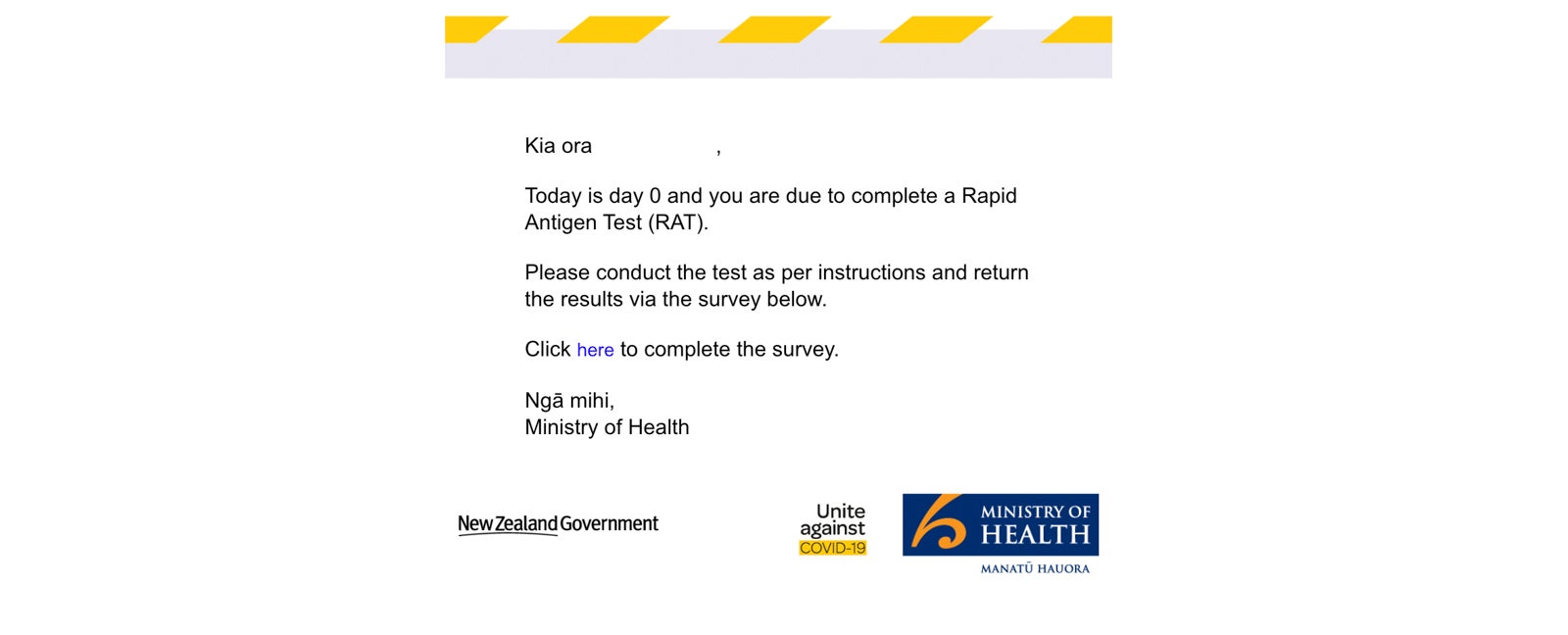 Once I had, I queued up for another checkpoint where a customs official was looking over passengers' arrival cards and then directing each person to take a bag with three self-administered rapid antigen tests. We were to take one that evening and another five days later. The third was for backup. At the same time, I noticed that I had received an email from New Zealand's Ministry of Health with a link where I could register the results of my first test.