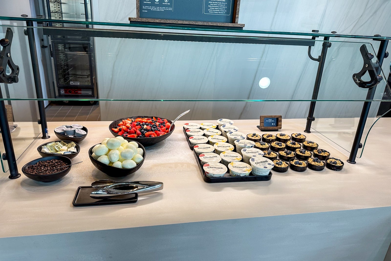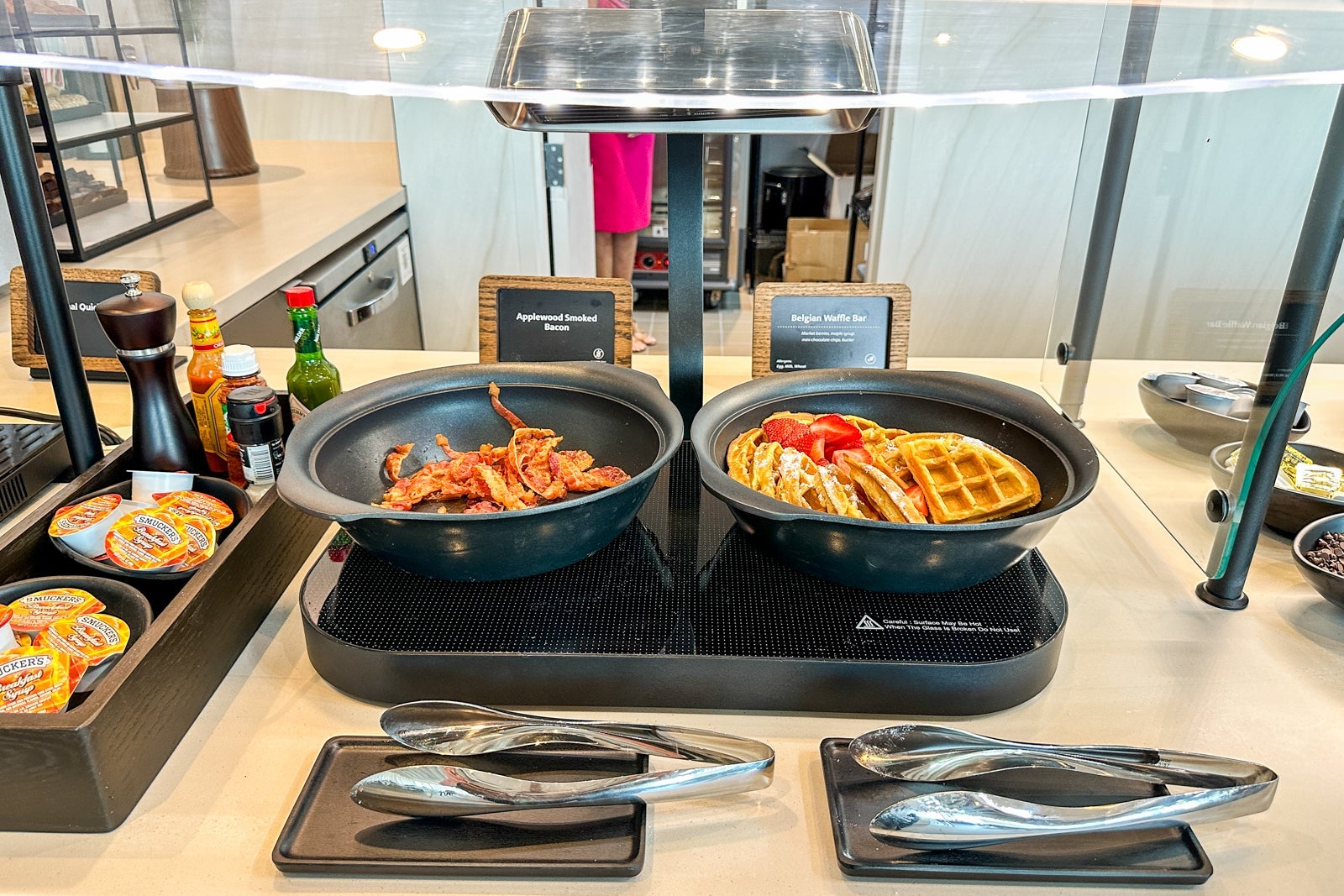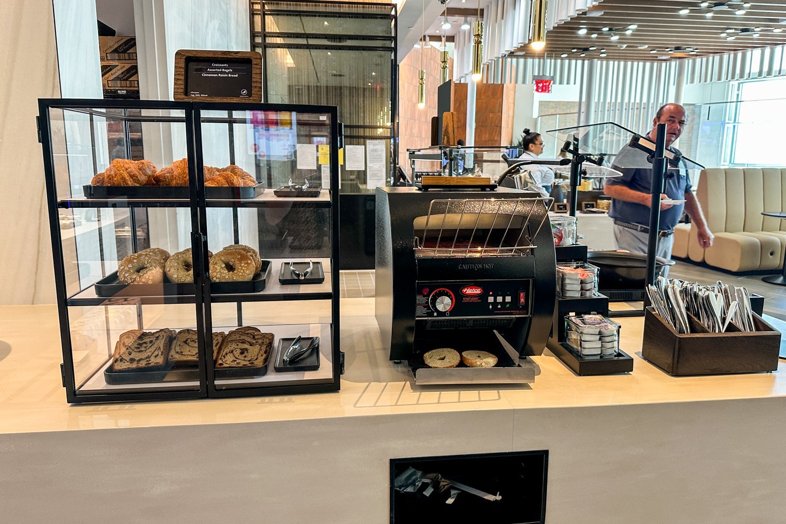 During our morning visit, we were able to get a sampling of breakfast options, including a savory quiche tartlet that seemed to replace many lounges' watery scrambled eggs, a Belgian waffle and bacon that wasn't exactly crispy but still tasted delicious. Other breakfast items include fresh fruit, yogurt, oatmeal and an assortment of breads and pastries.