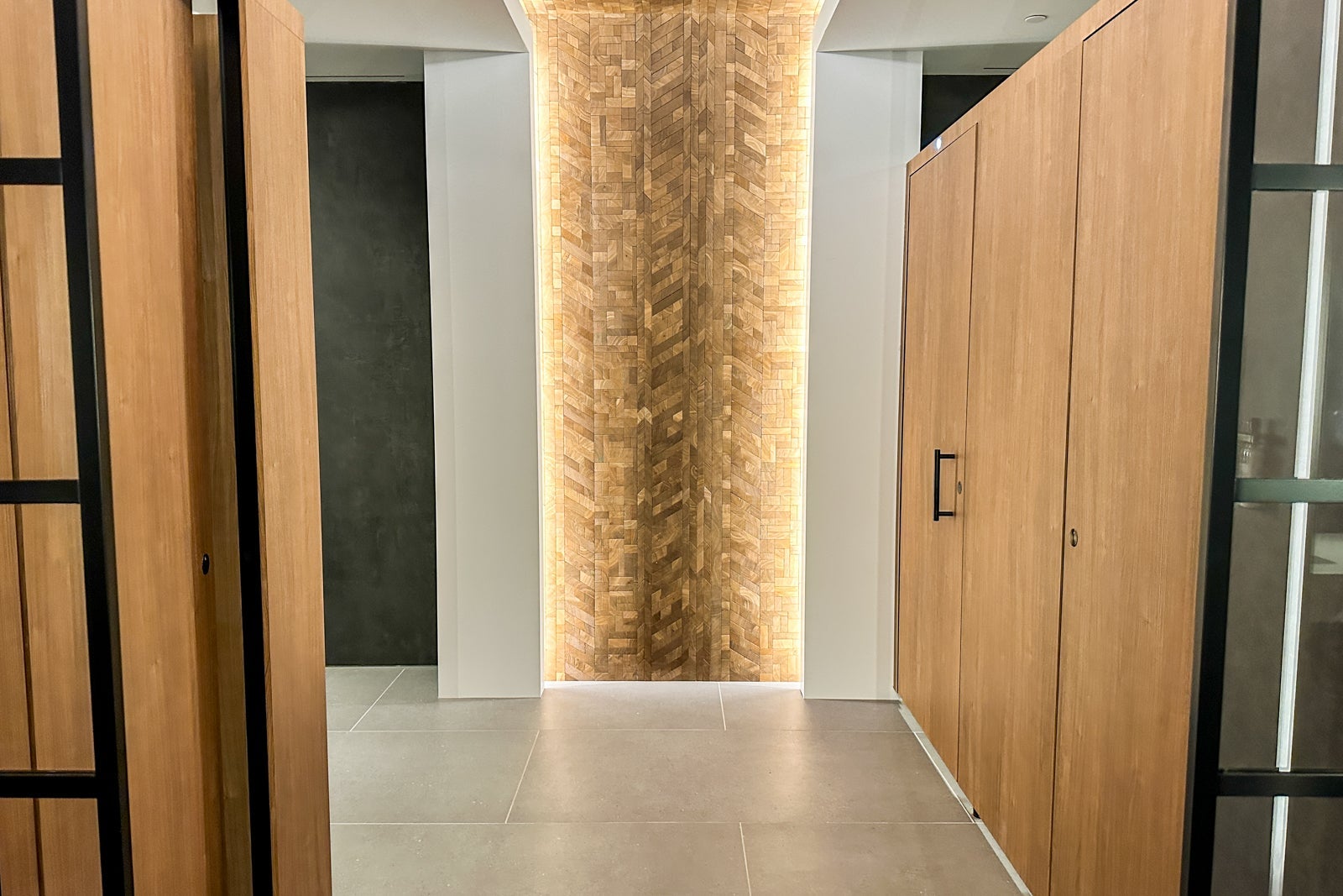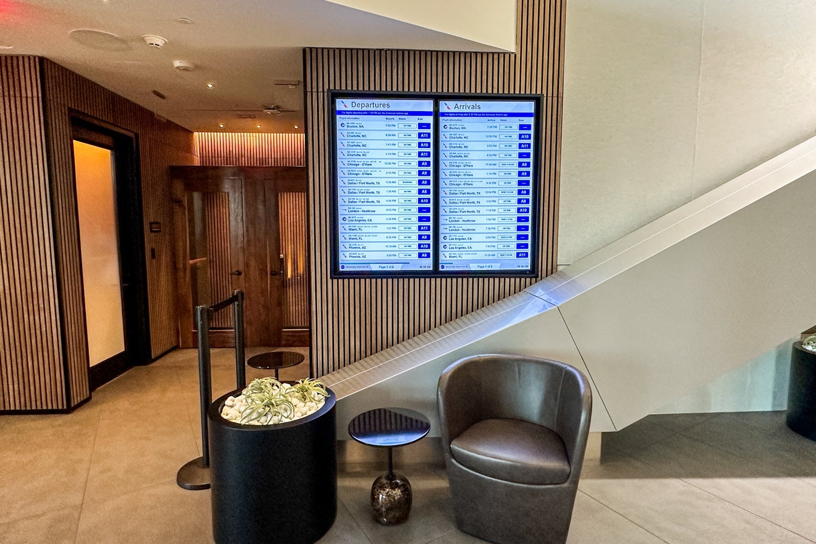 For example, the entrance to the lounge features a dark, moody wall with the American Airlines logo and metal elements that pay tribute to the area's many bridges.