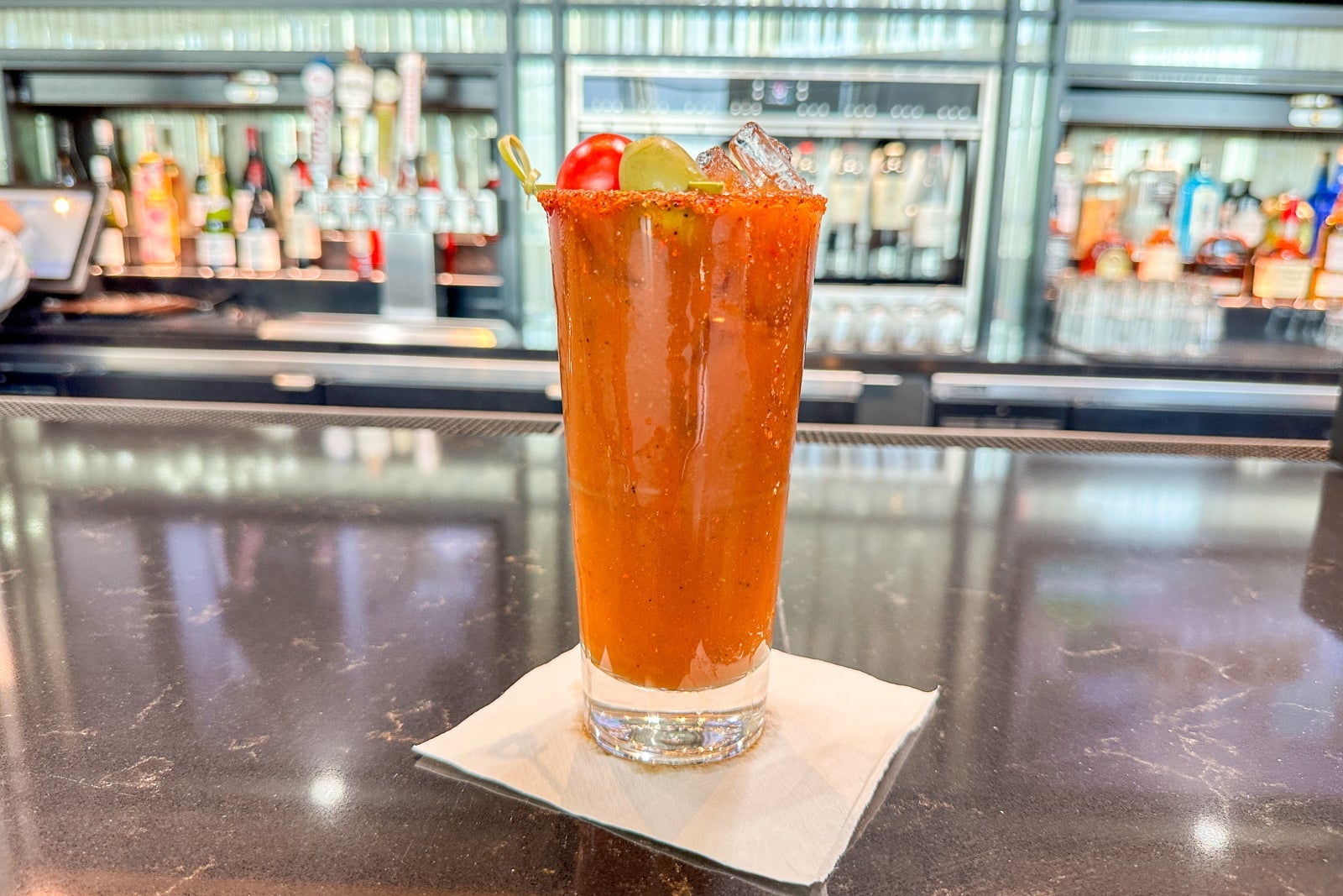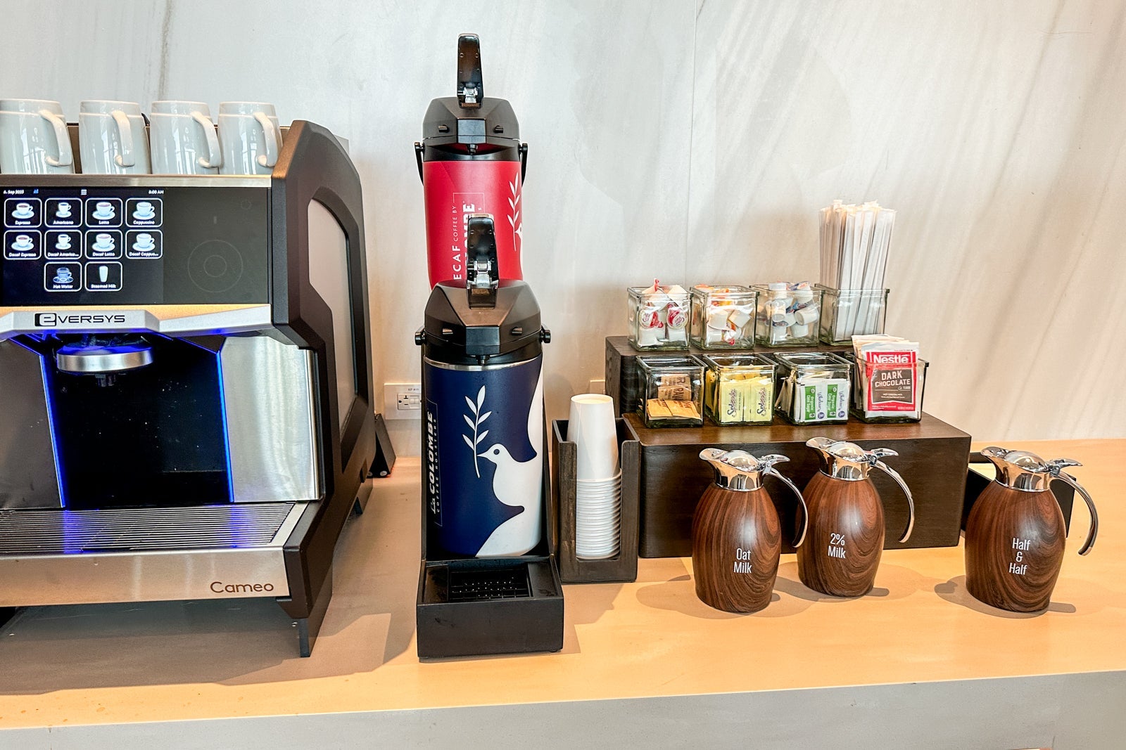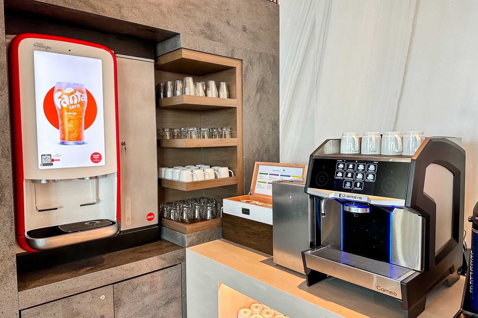 Throughout the day, you'll find La Colombe coffee (sadly, not iced), various teas and a touchscreen soda fountain with Coca-Cola products.