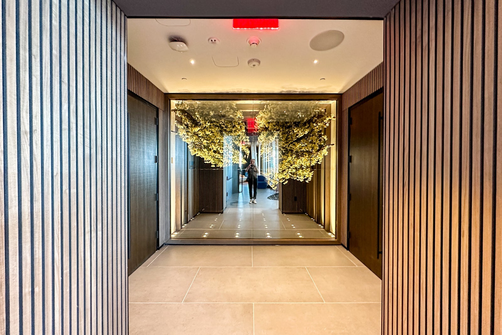 Near the bathrooms, a mirrored glass wall is home to beautiful Newark cherry blossoms from Branch Brook Park.