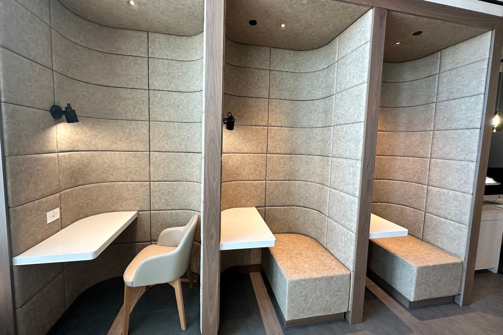 Toward the lounge's entrance are three workstations designed like individual cubbies, but those areas are not completely enclosed. The most private spaces in the lounge are the two phone booths, located right off the entrance, and a conference room that can be booked directly on American's website for a fee.