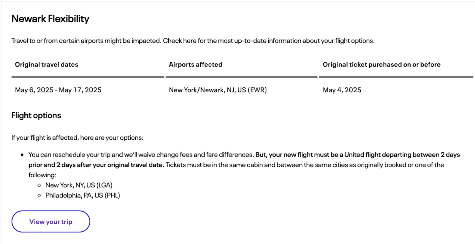 United extended a travel advisory that allowed passengers with trips booked through May 17 to make changes, including flying out of nearby LaGuardia Airport (LGA) — where it operates flights, but with a more limited schedule than at its Newark hub.