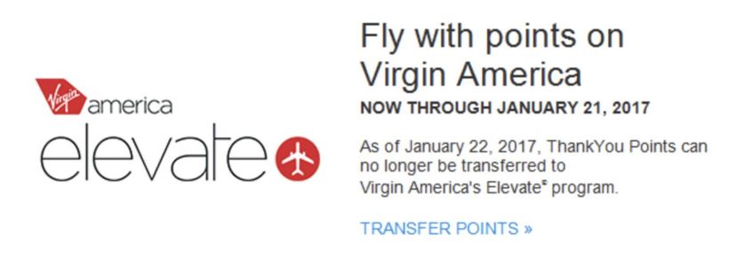 Citi recently announced in an email communication that as of January 22, 2017, ThankYou points can no longer be transferred to Virgin America. This comes just a day after the Alaska Airlines and Virgin America merger closed, making this somewhat expected, as the Virgin America Elevate program may be phased out — although that's still up in the air.