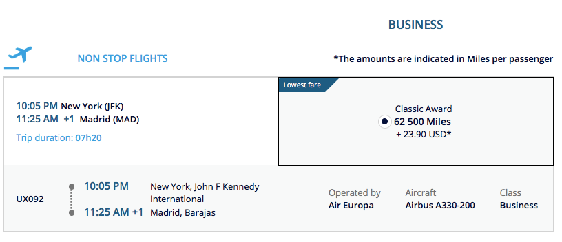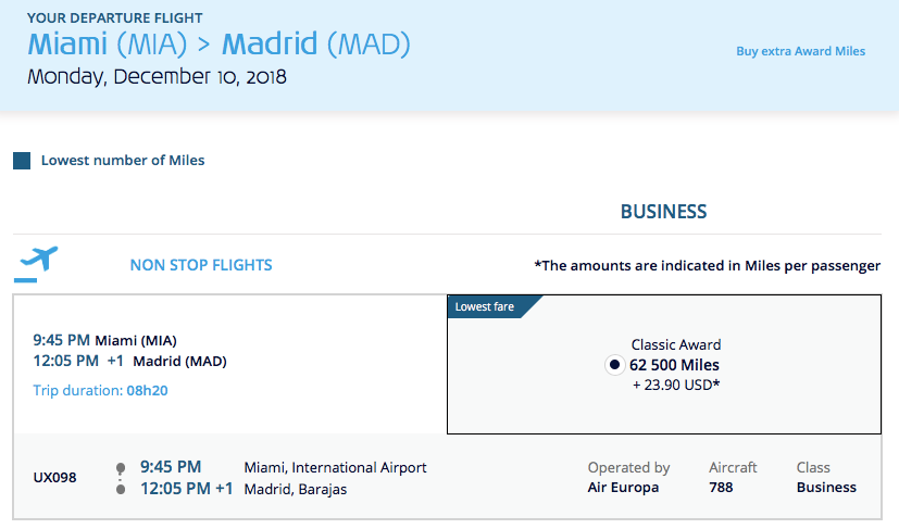 For at least two more days, you can book SkyTeam member Air Europa from Miami or New York to Madrid for 62,500 Flying Blue miles and $23.90 one-way from the US.