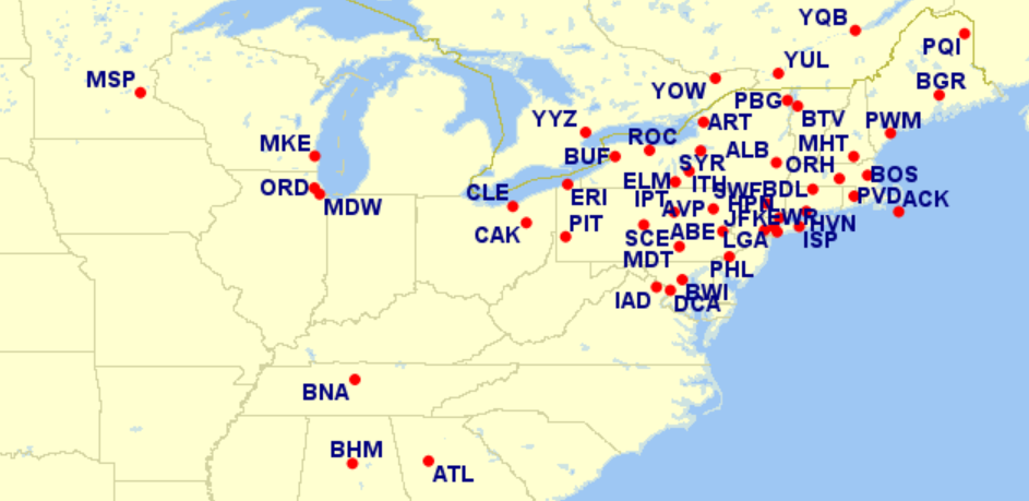 - Airports covered: Akron/Canton, OH (CAK); Albany, NY (ALB); Allentown, PA (ABE); Bangor, ME (BGR); Buffalo, NY (BUF); Burlington, VT (BTV); Cleveland, OH (CLE); Elmira, NY (ELM); Erie, PA (ERI); Harrisburg, PA (MDT); Ithaca, NY (ITH); Manchester, NH (MHT); Montréal, QC, CA (YUL); New York-Kennedy, NY (JFK); New York-LaGuardia, NY (LGA); New York/Newark, NJ (EWR); Ottawa, ON, CA (YOW); Philadelphia, PA (PHL); Pittsburgh, NY (PIT); Plattsburgh, NY (PBG); Portland, ME (PWM); Presque Isle, ME (PQI); Quebec City, QB, CA (YQB); Rochester, NY (ROC); State College, PA (SCE); Syracuse, NY (SYR); White Plains, NY (HPN); Wilkes-Barre/Scranton, PA (AVP)