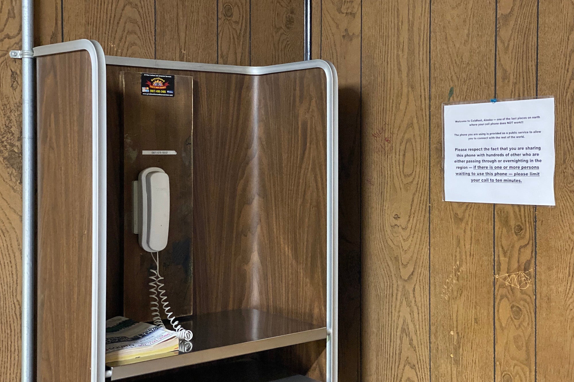 Until cell service arrived a couple of years ago, landline phones brought the only communication with the outside world. That isn't the case anymore, though. An outdated sign by the telephone claims that Coldfoot is "one of the last places on earth where your cellphone does NOT work!!!."