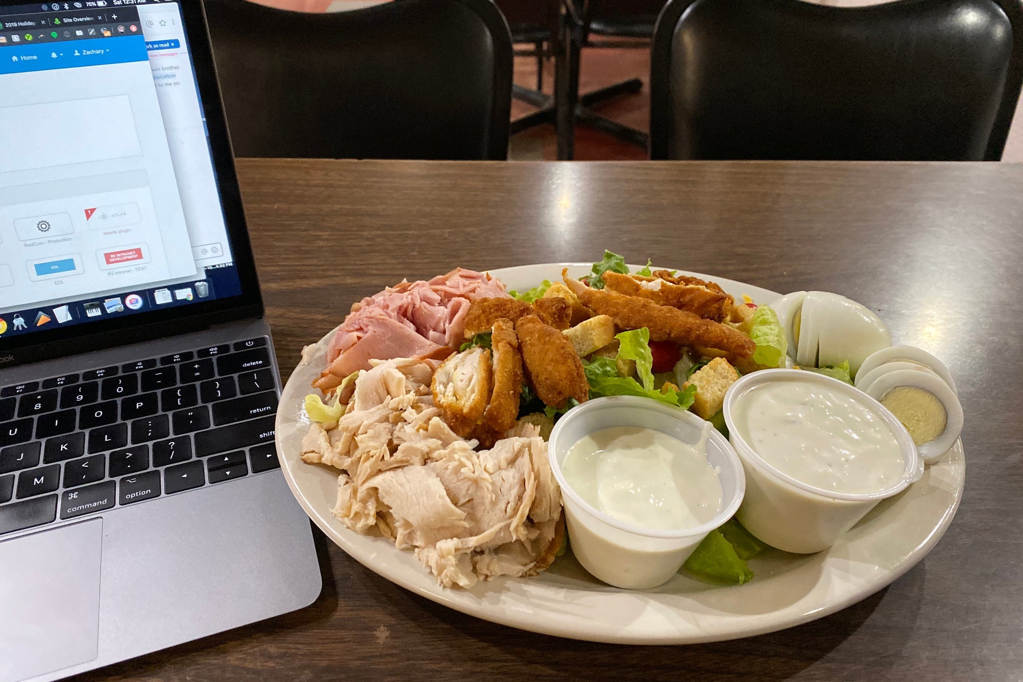 First, it was time for dinner, and a bit of work. Most of the items seemed pretty hearty, and considering I'd be eating all of my meals there for two days, I decided to start off a bit light.