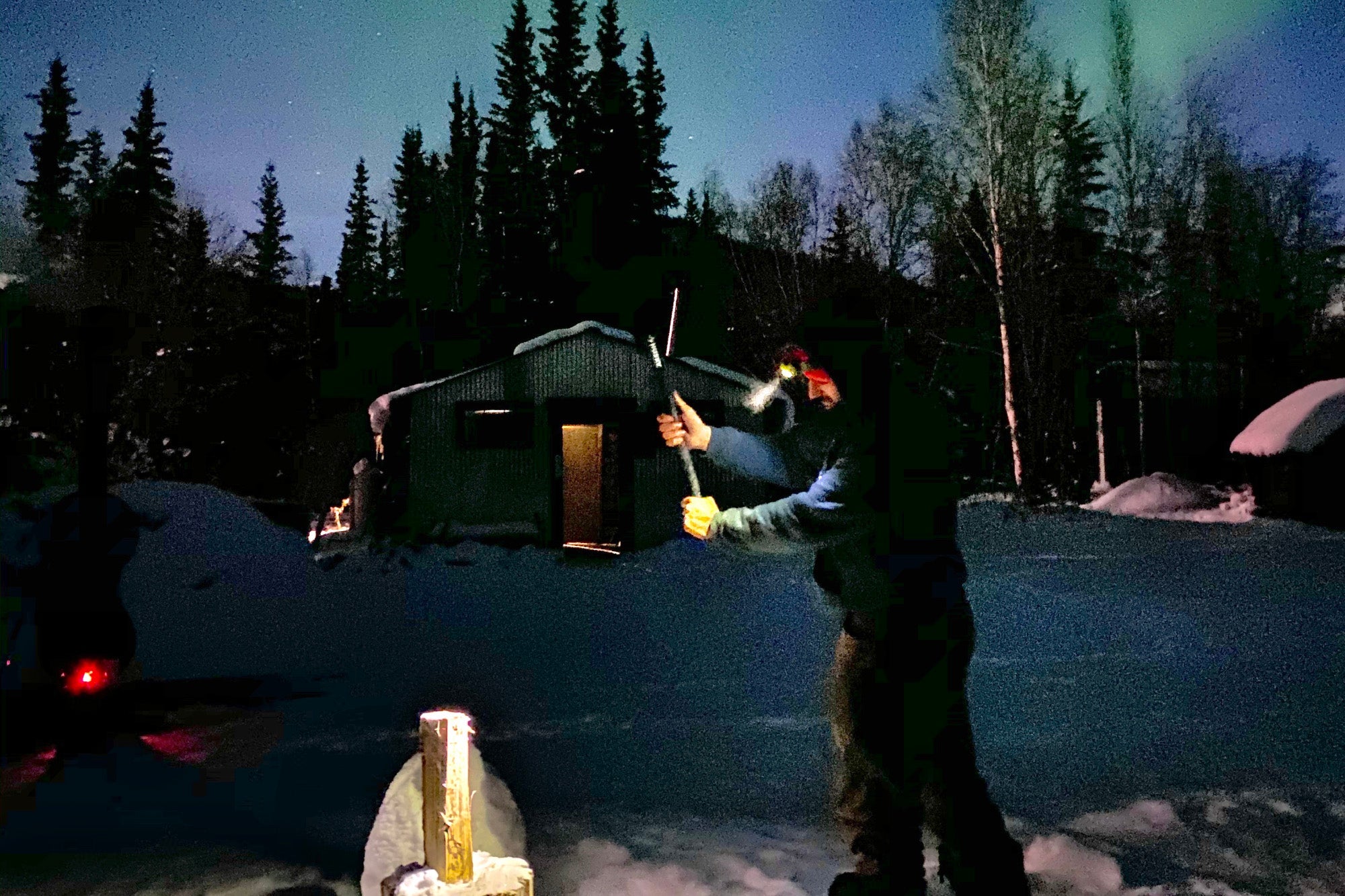 After arriving at Wiseman, Dan chopped some wood, and got a fire going to keep us warm.