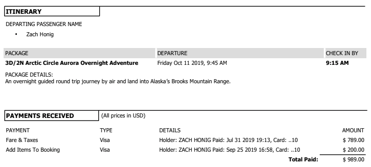 I later added a daytime Arctic Mountain Safari, including an afternoon drive through the Brooks Range for $129, plus two nights of shooting the aurora borealis in Wiseman, for $89 each. Including a $200 single supplement, plus the tour add-ons, my total came to $1,296. Fortunately, the charge coded as travel with my Chase Sapphire Reserve, netting me 3,888 Ultimate Rewards points, worth $77.76, based on TPG's valuations.