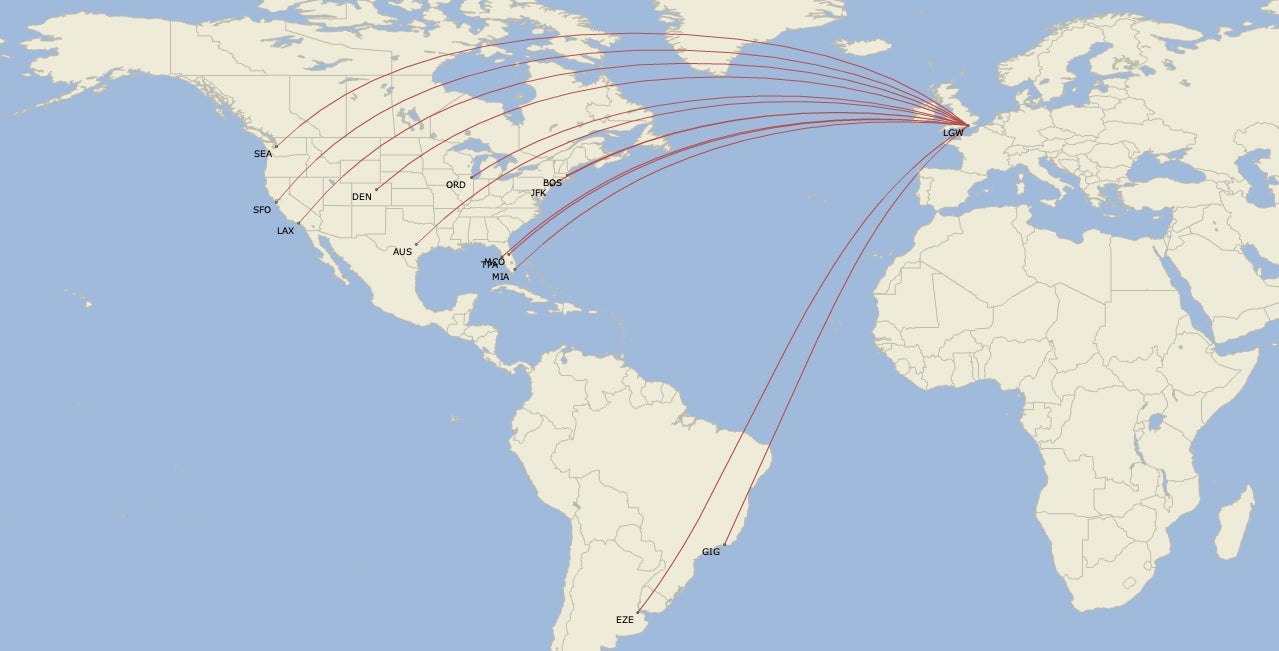 Norwegian's UK-based subsidiary currently flies between Gatwick and 13 destinations in the Americas, according to Cirium schedule data. Destinations include Denver (DEN), New York John F. Kennedy (JFK) and Orlando (MCO) in the U.S., as well as Buenos Aires (EZE) and Rio de Janeiro (GIG) in Argentina and Brazil, respectively.