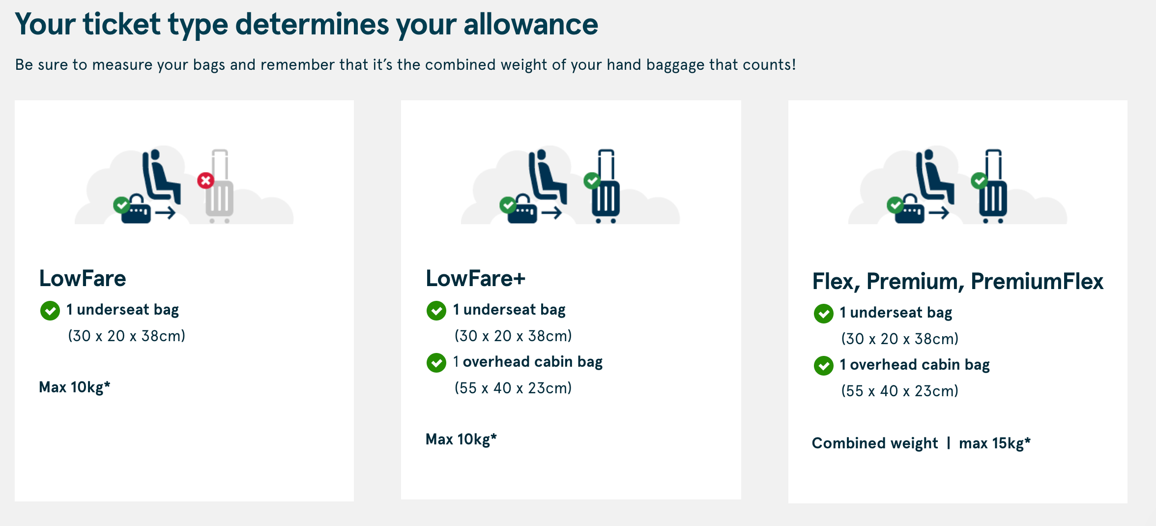 To offset the new change, Norwegian increased size and weight allowances on cabin- and checked-luggage requirements. The maximum weight for each checked bag is now 23 kg (50.7 pounds), up from 20 kg (44 pounds). Flex and Premium customers can also bring on a combined total of 15 kg (33 pounds) of cabin luggage, up from 10 kg (22 pounds). All travelers are allowed to bring one airport shopping bag in addition to their ticket-type baggage allowance, according to the airline guidelines.