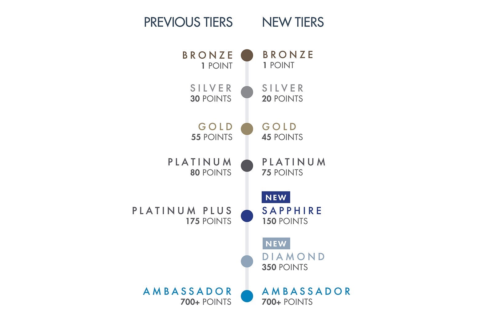 As part of the revamp, the fifth tier of the program, Platinum Plus, is being renamed Sapphire and now will take 150 points to reach, down from 175 points. The requirement to reach the top tier of the program, Ambassador, remains the same at 700 points.
