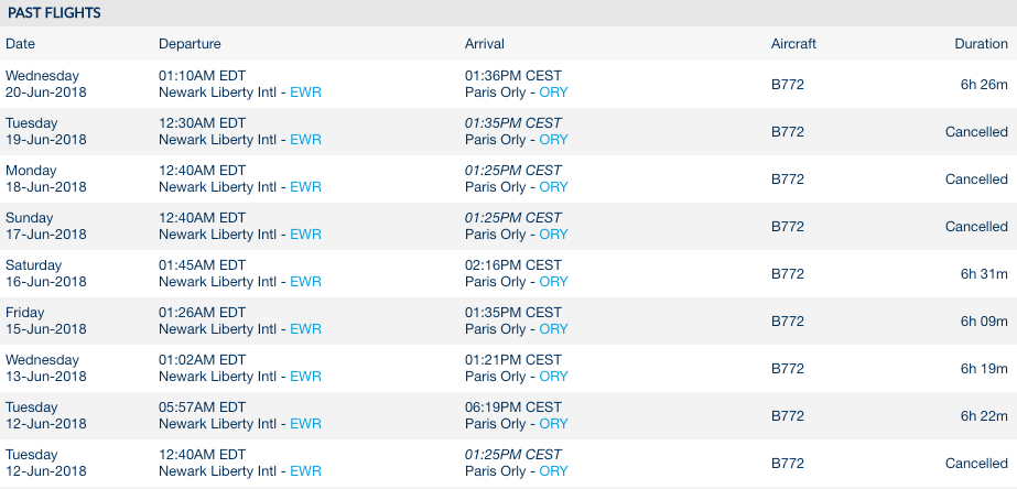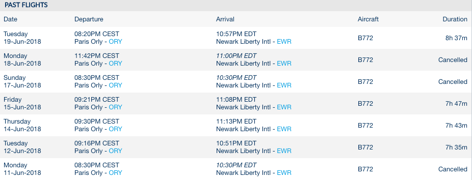 So far in June, there have been at least seven cancellations on that route, with five in the past week alone (three cancellations outbound to ORY and two cancellations inbound to EWR), according to FlightAware.