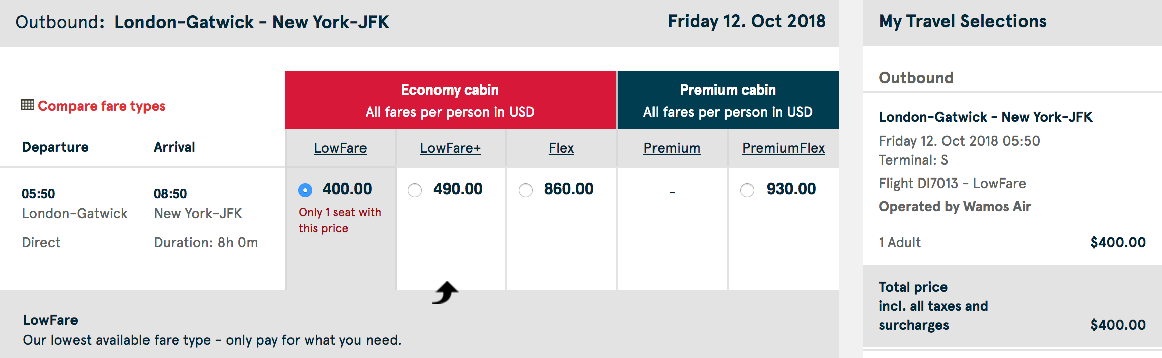 For example, if you're in London and looking to get to New York, one-way fares seem to hover around the $400 mark before Oct. 14. On Oct. 12, the fare totals $400, however, before taxes, it's $242.50. So, you'll be paying $279 with the 50% discount and full taxes — still better than paying full-fare.
