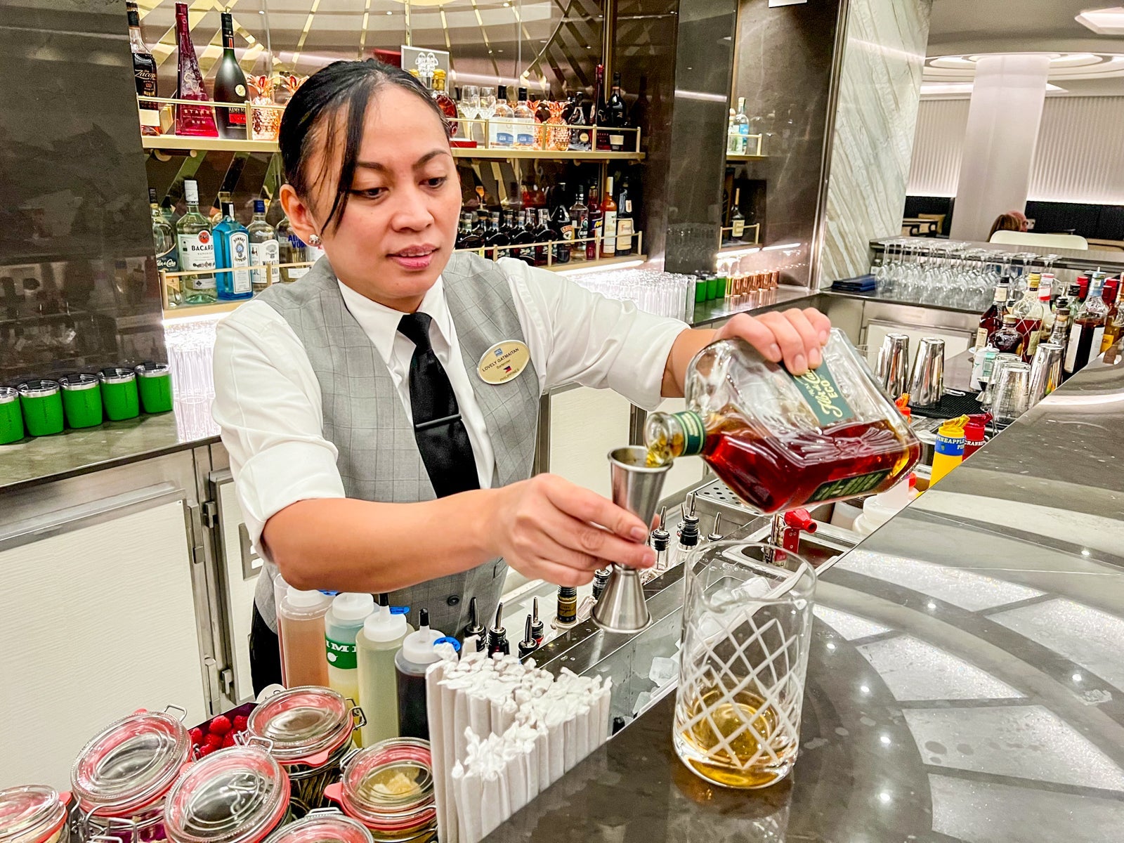 There really were banana peels in it, but none that you could see. As Lovely, the bartender, explained, the back-of-house staff at the venue makes a homemade banana peel syrup by boiling banana peels collected from around the ship. It's boiled down so much that it turns into a nearly clear, sweet liquid used to infuse the Primadonna and other drinks at the bar.