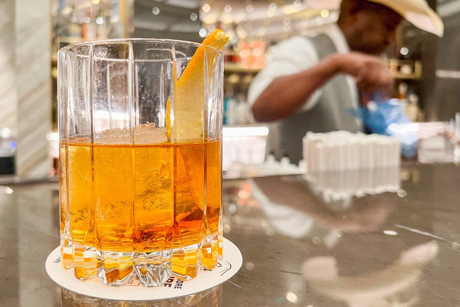 Put it all together, pour it over a single large square ice cube, and what you get is something that tastes like a fairly traditional, old-fashioned-y drink, not something new and concocted.