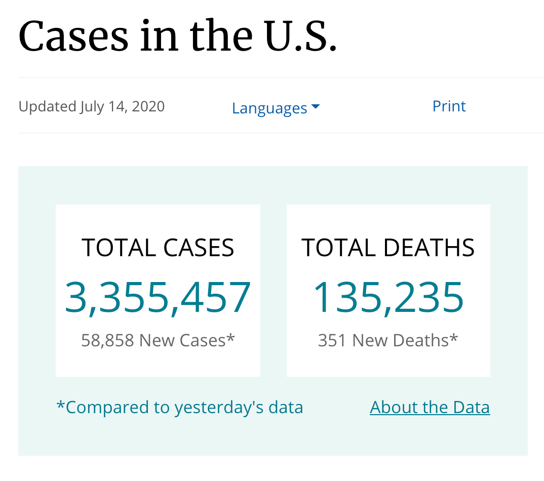 As of today, July 14, the Centers for Disease Control and Prevention (CDC) has tallied more than 3.3 million cases and 135,000 U.S. deaths due to COVID-19 — an increase of 1.1 million cases and 14,000 deaths since this article was originally published on June 24.