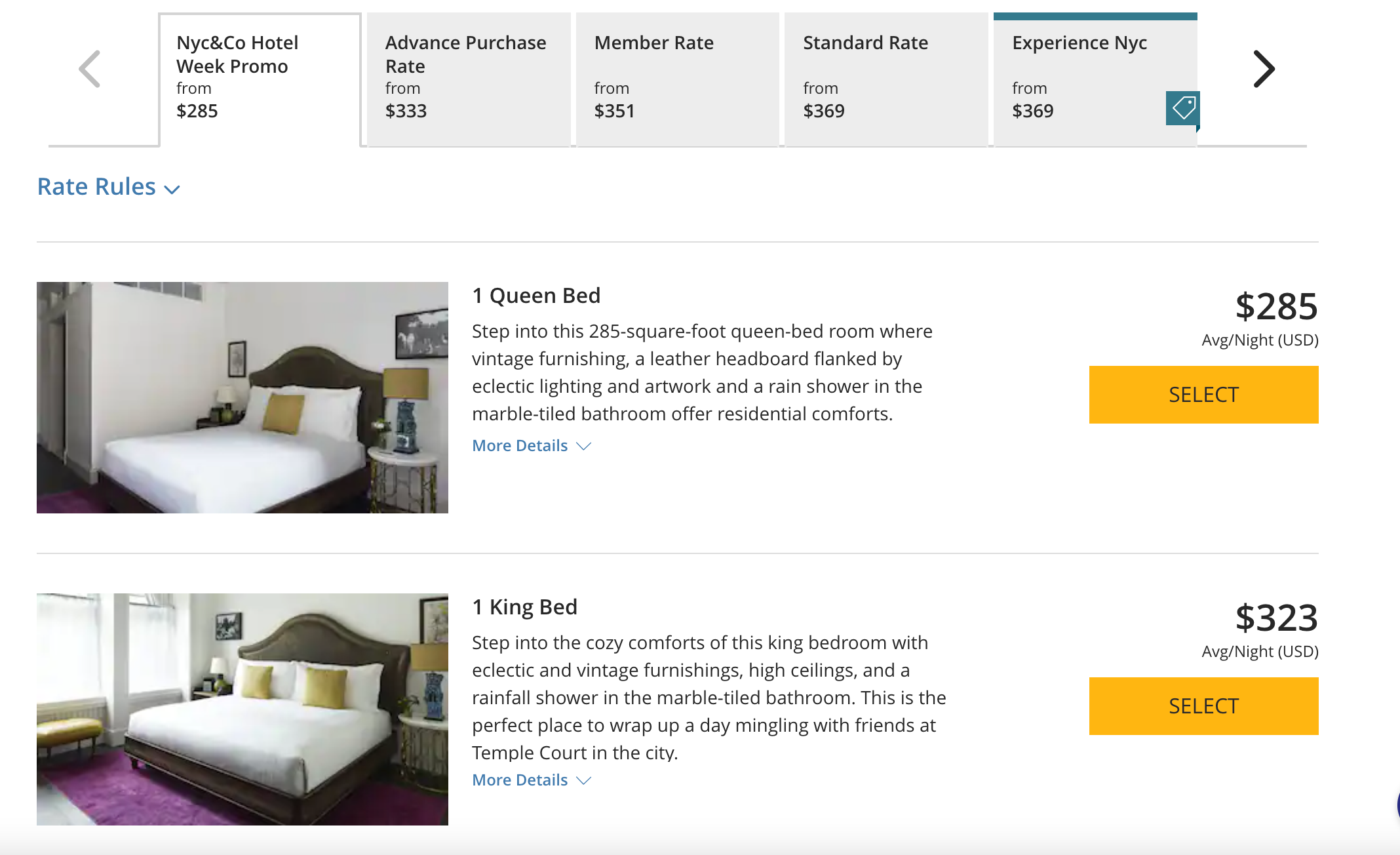 With the NYC Hotel Week promotion, cash rates for a one-night stay at this chic hotel on Jan. 15 start at $285 a night (plus taxes and fees) for a queen room, compared to $333 for the World of Hyatt advance purchase rate, $351 for the member rate and $369 for the standard rate.
