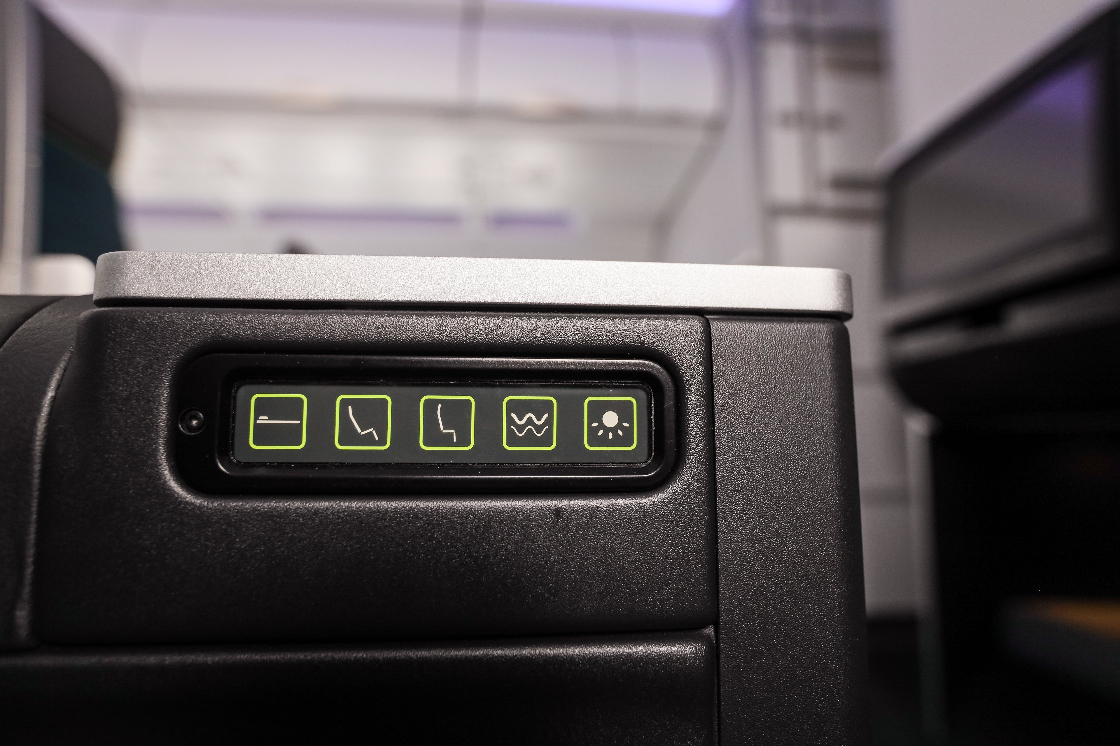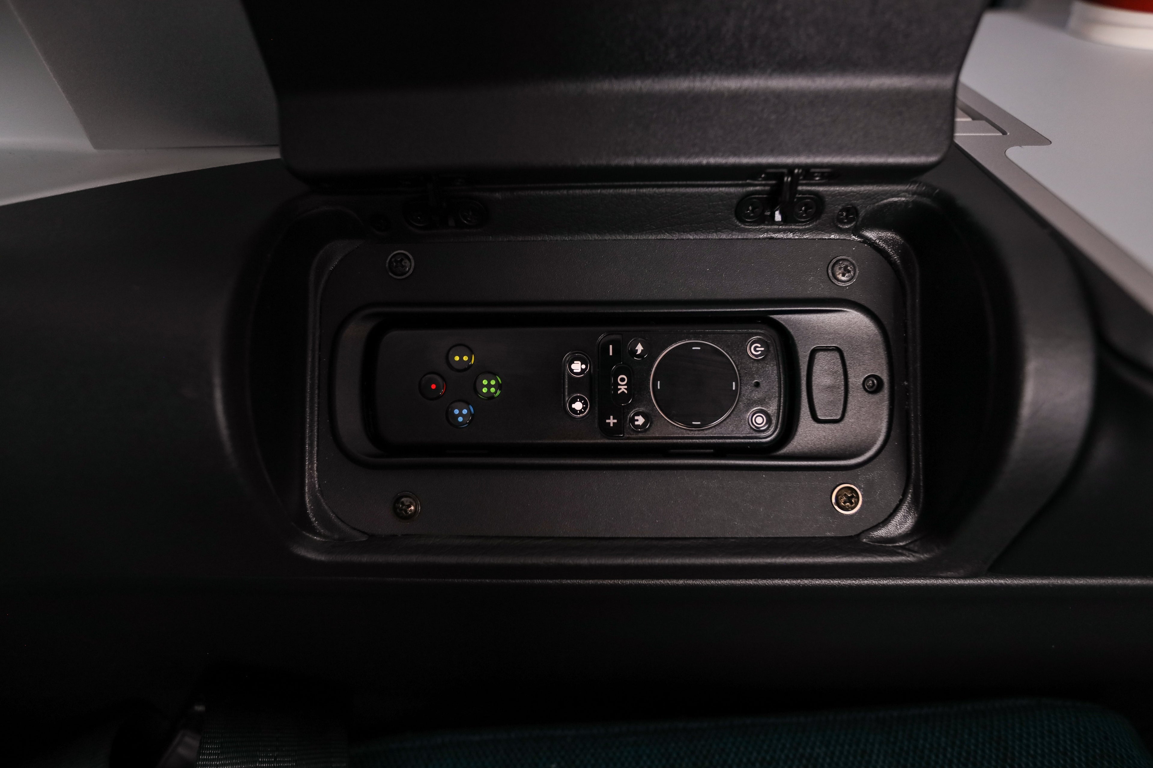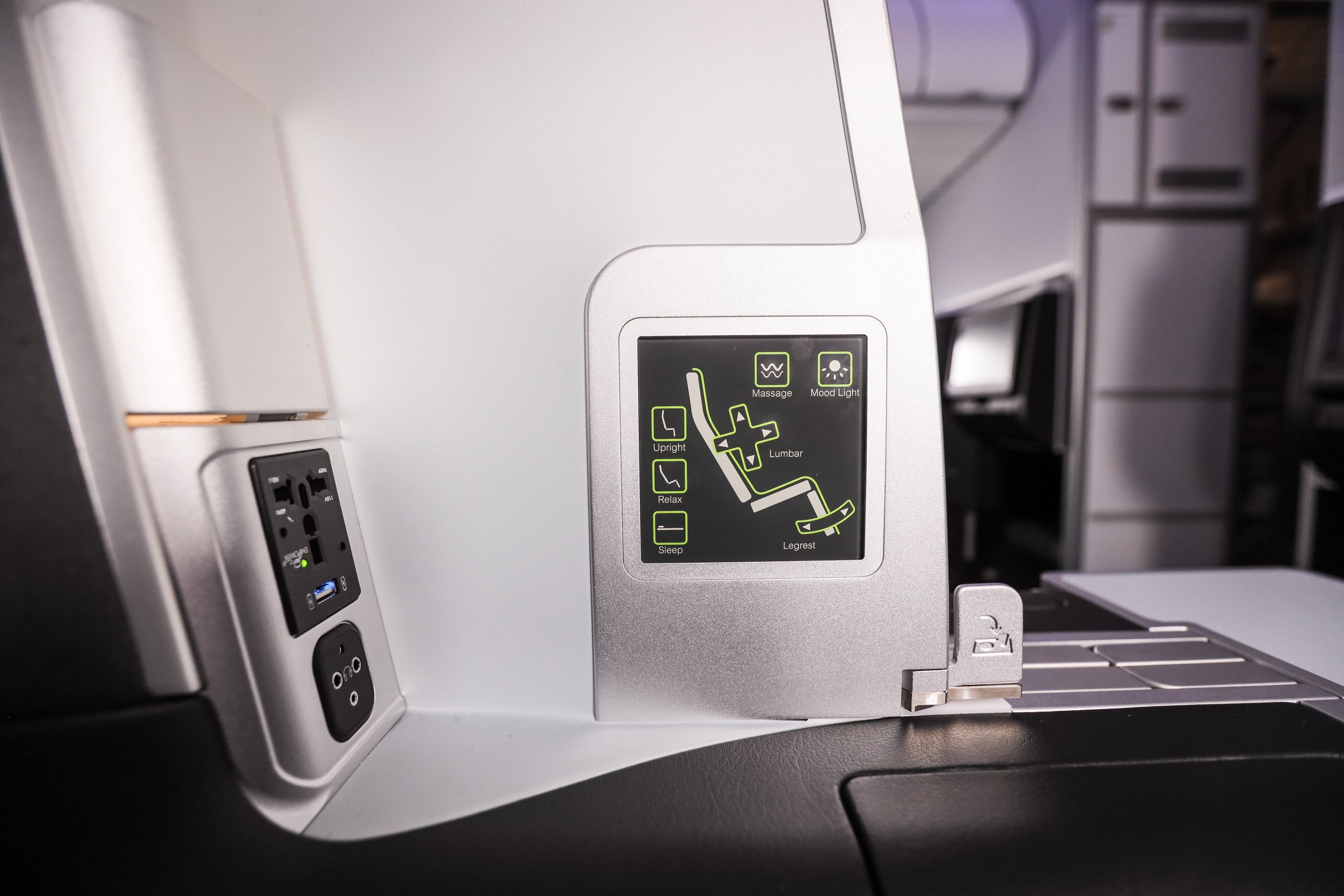 The seat also features an over-the-shoulder seat beat, an adjustable reading light, two seat control panels, a universal power outlet and USB port and a handheld controller for the IFE — although operating via touch screen was far simpler.