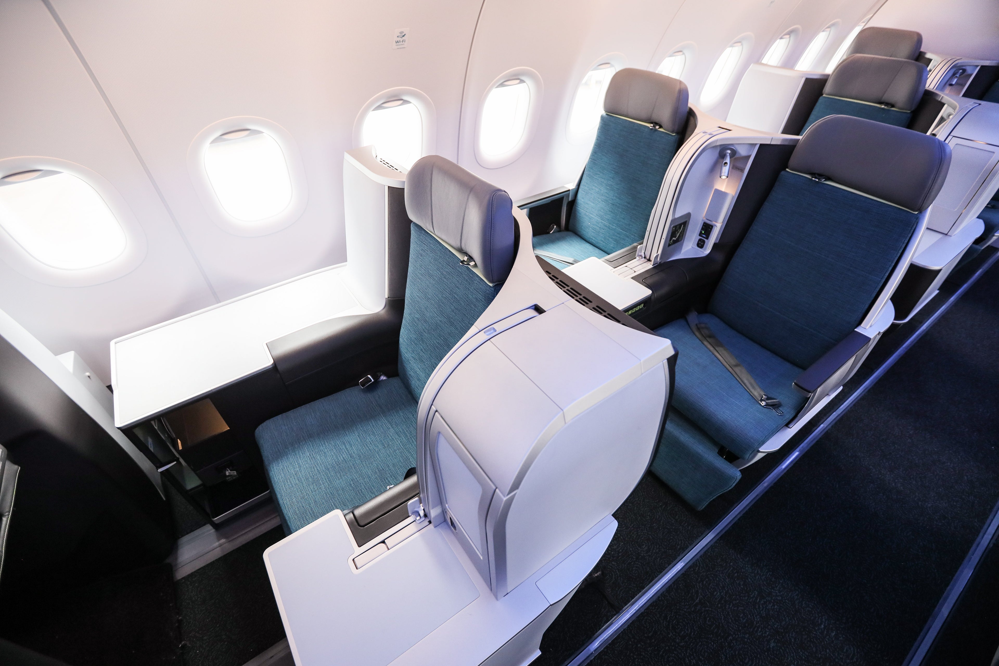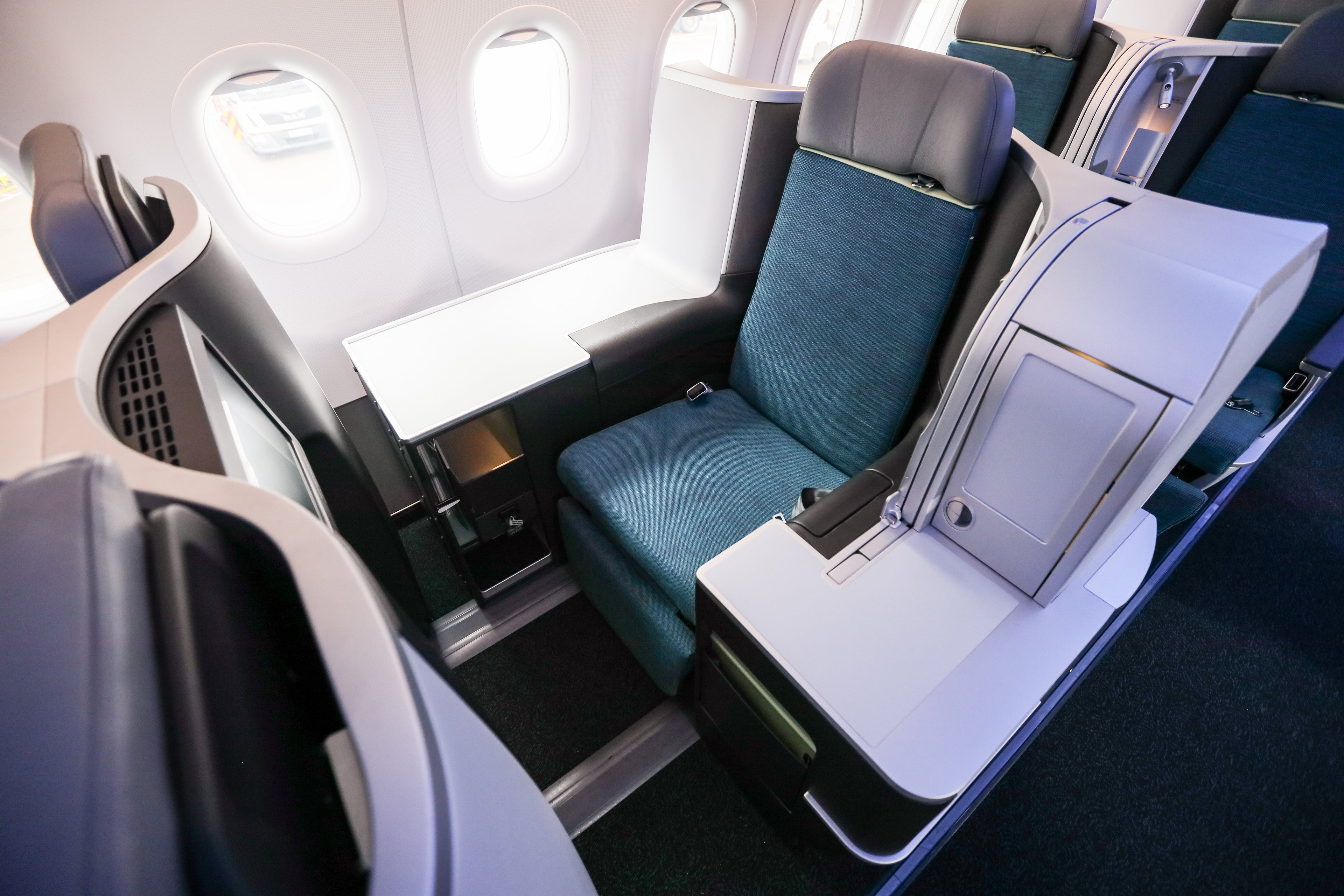 - The business-class cabin offers a mix of 'throne' solo seats and paired seats, with fully flat beds, ample storage and modern amenities including power outlets and Wi-Fi.