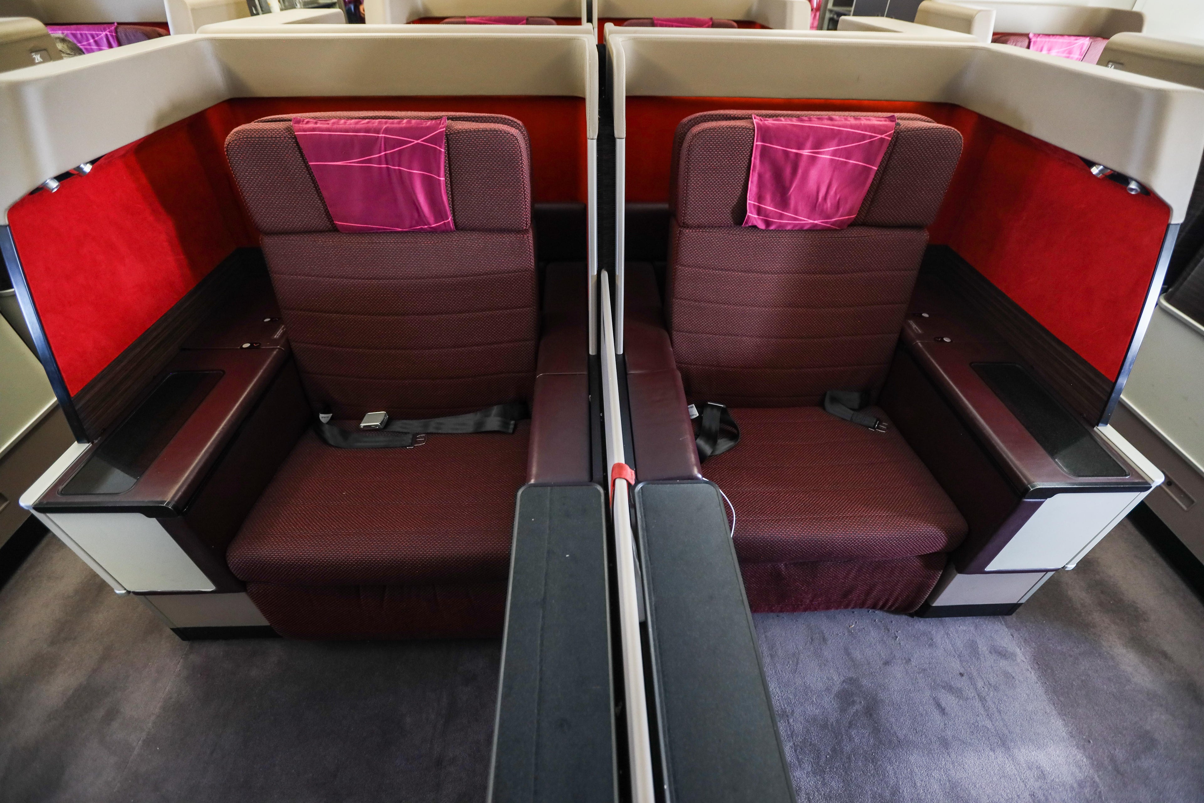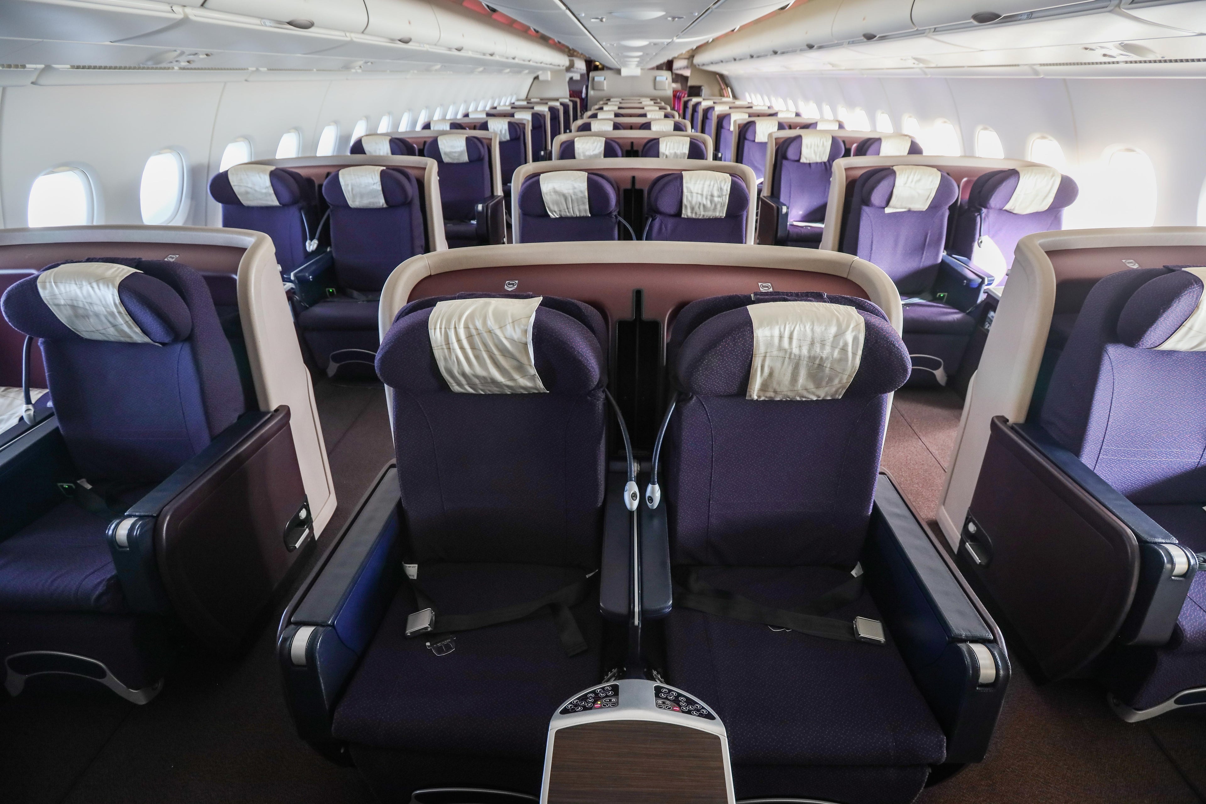 There are 66 business-class seats in a 2-2-2 configuration — each with a seat pitch of 76 inches and lie-flat bed.