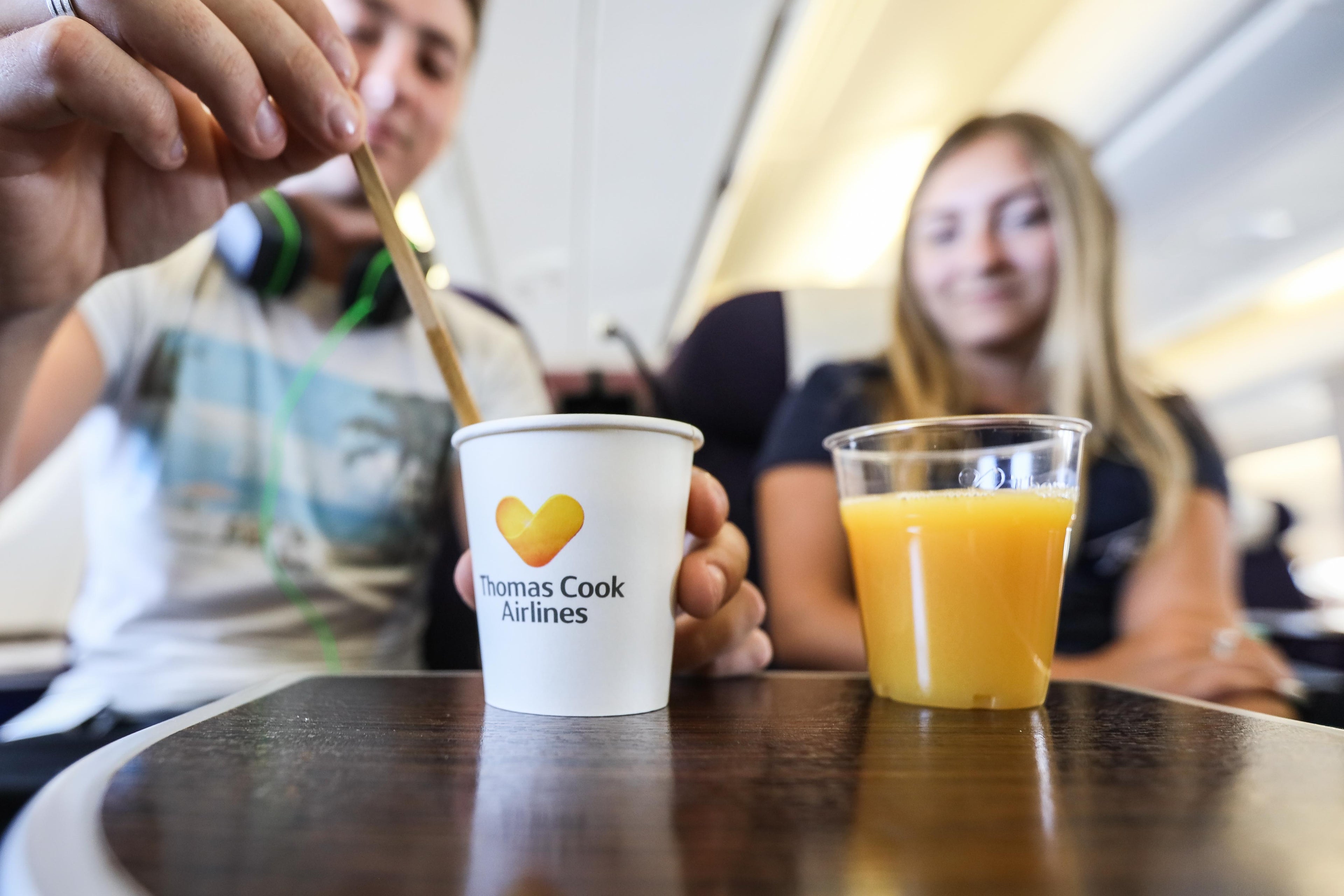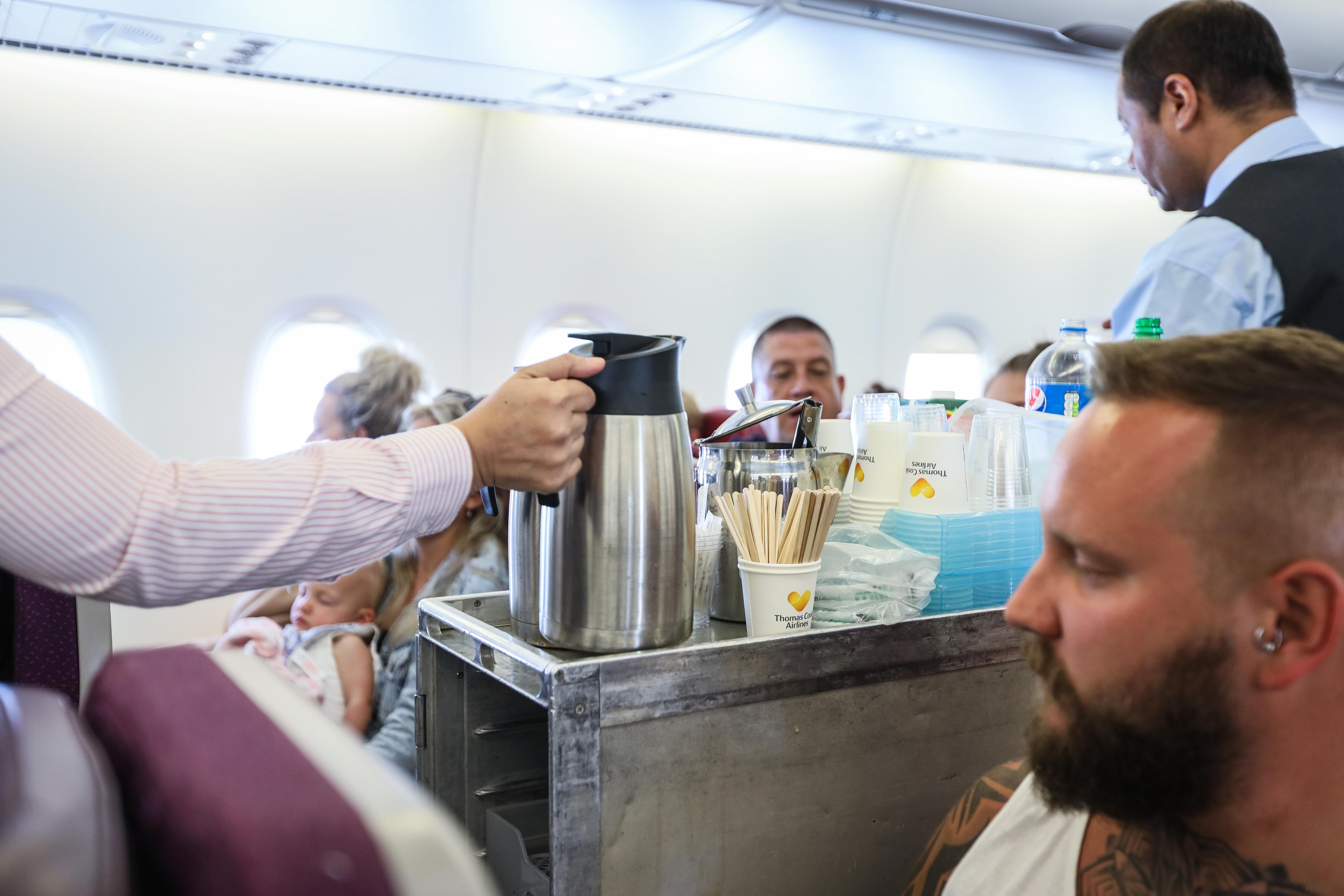 Shortly after takeoff of flight MH8493, the crew served complimentary hot and cold drinks, with Thomas Cook-branded cups — a bizarre image coming from the defunct airline.