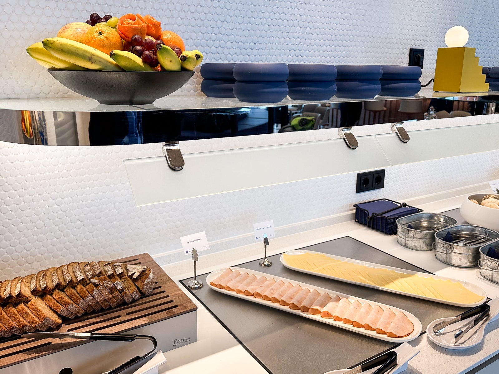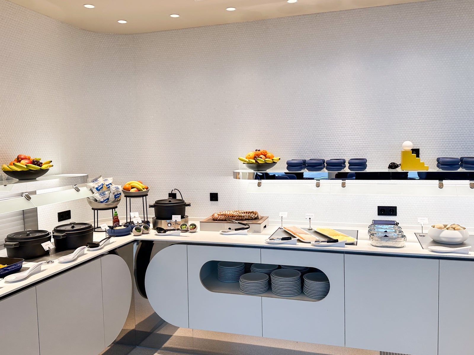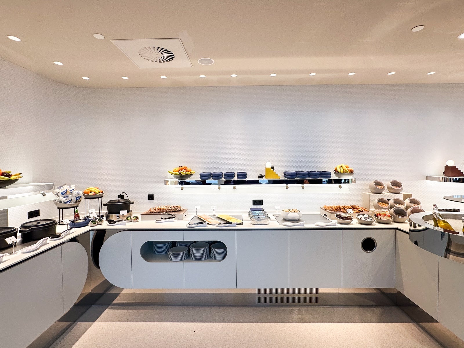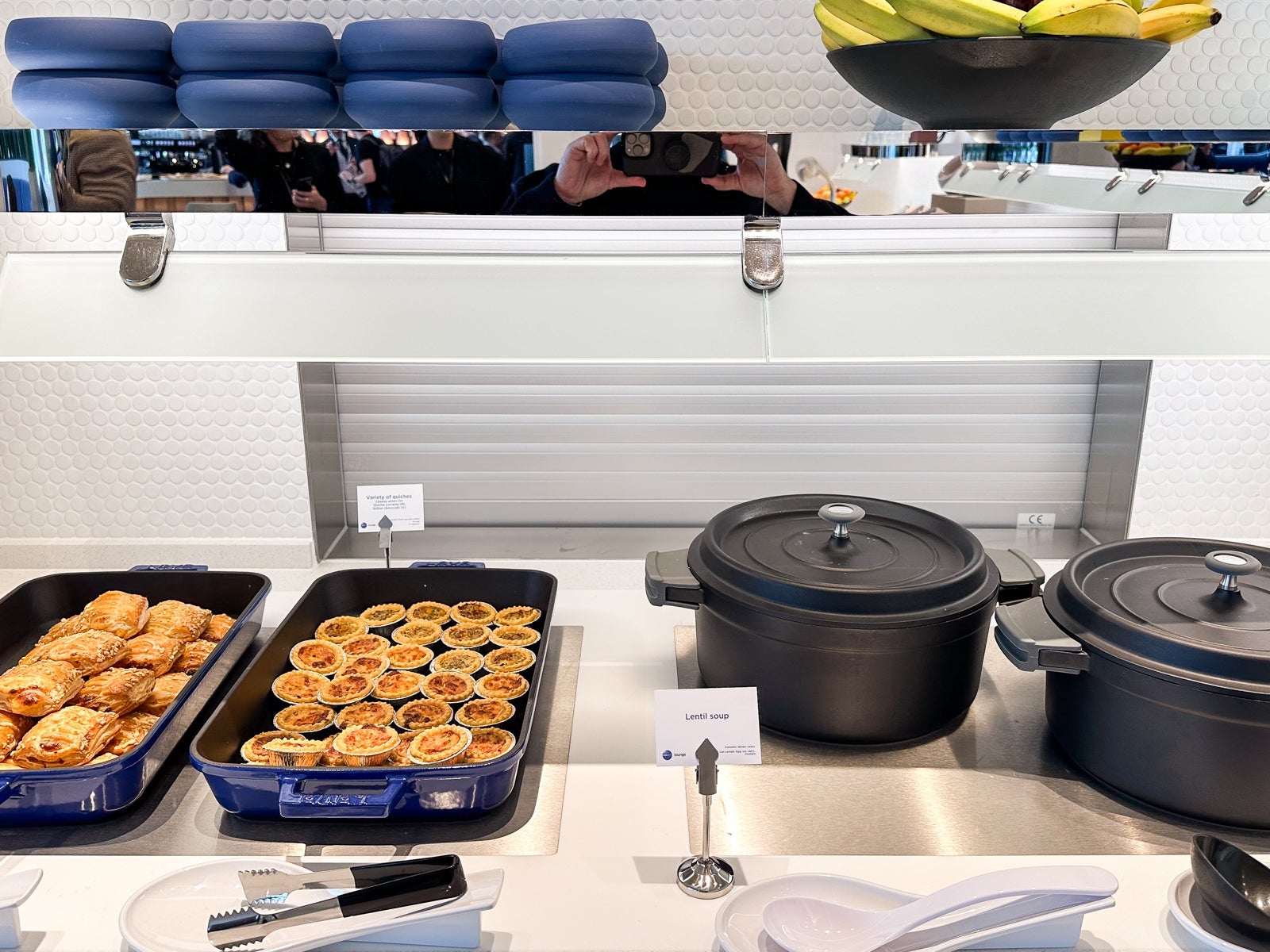 The lounge features a decent array of foods at a buffet, but there's no at-seat service. There was a selection of hot and cold snacks like soups, pastries, salad, cheese and meats, and fresh fruit.