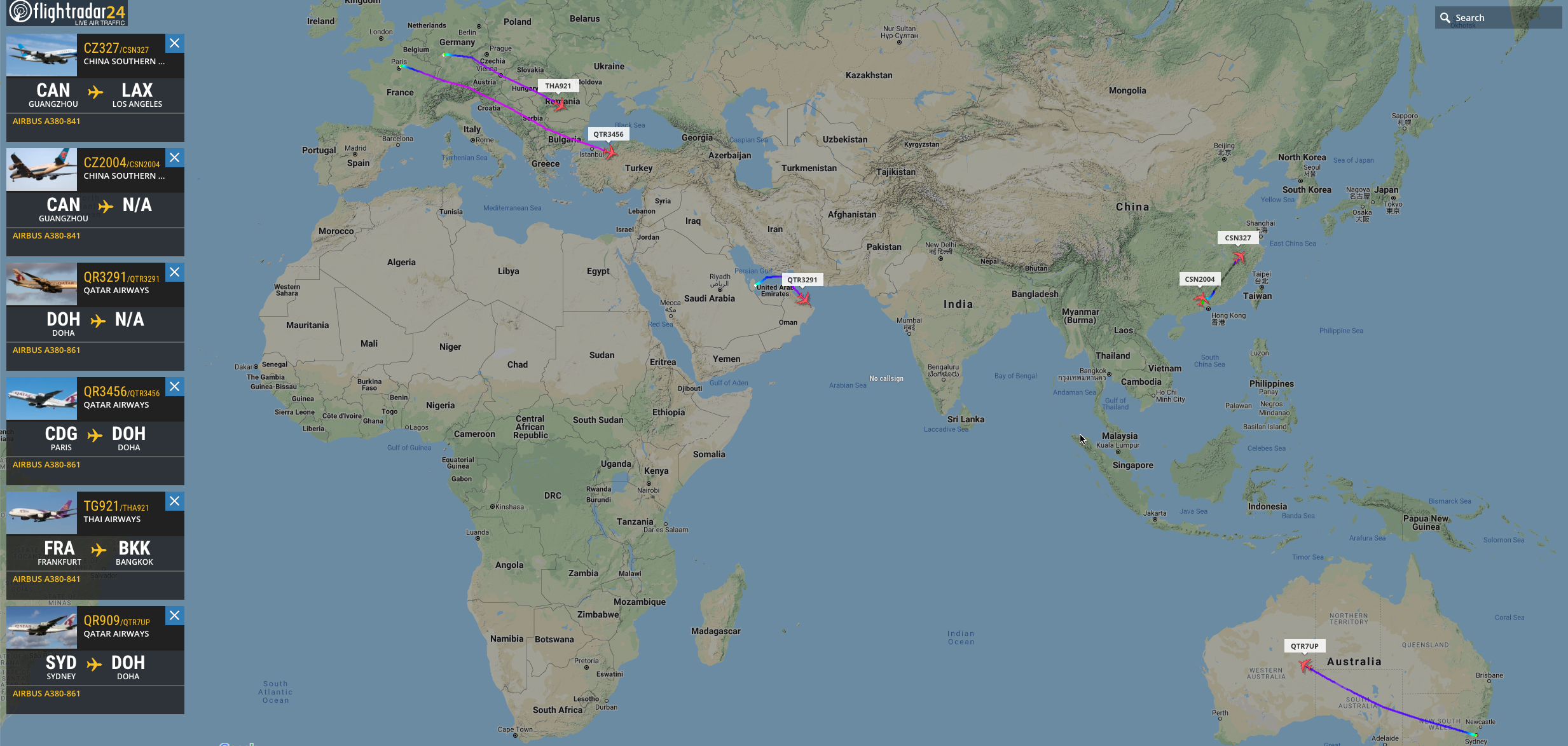 The Flightradar map showed Thai's formerly daily flight from Frankfurt to Bangkok, now operating on a reduced frequency; Qatar's ultra-long-haul from Sydney, Australia, to the airline's home base in Doha; and the China Southern flight to Los Angeles, now operating just three times a week — probably near-empty, since most foreign citizens are no longer allowed into China. Those three flights were running under their normal scheduled flight numbers. The other flights, such as Qatar's QR3456, bore the flight numbers in the thousands that often indicate non-scheduled or one-off operations.