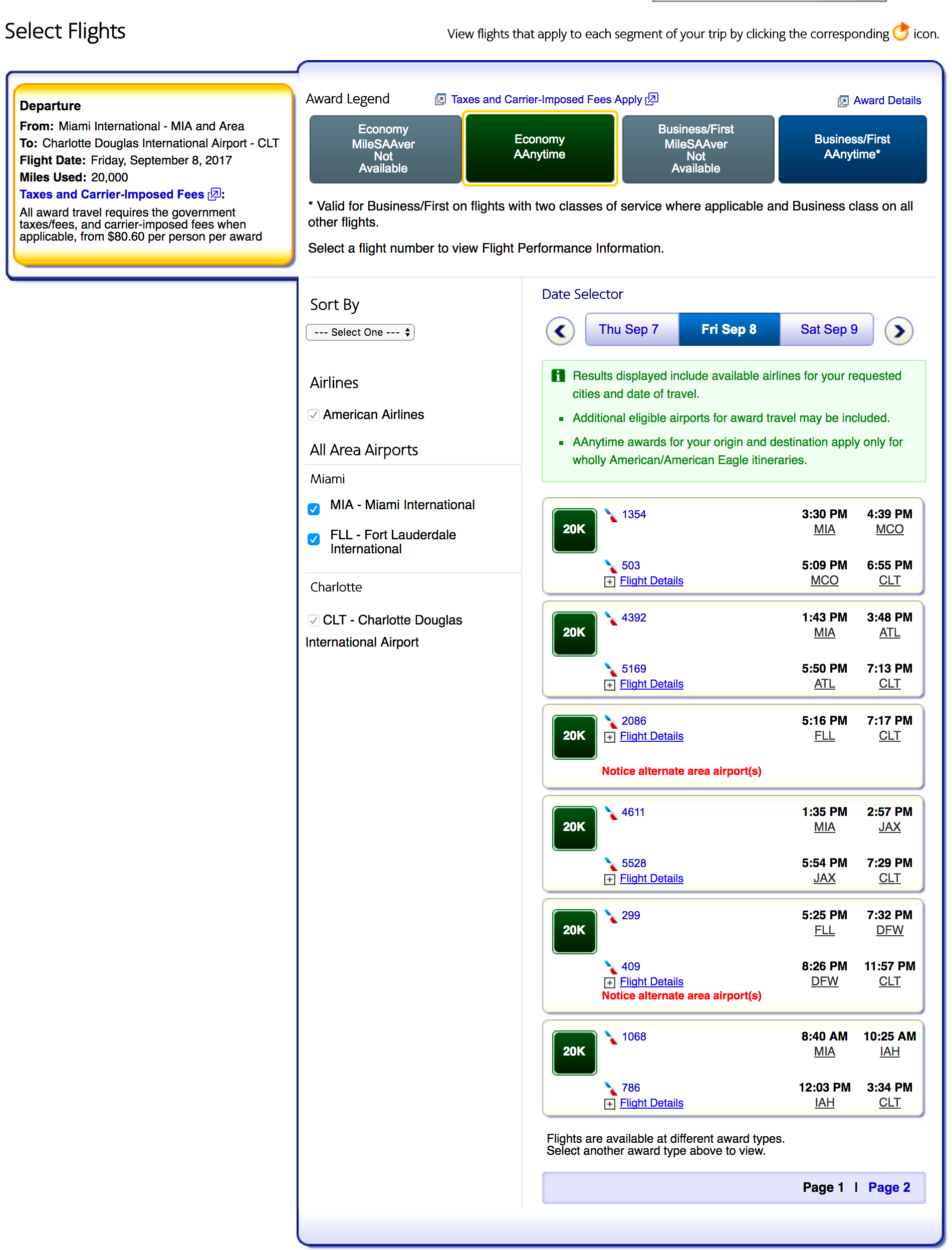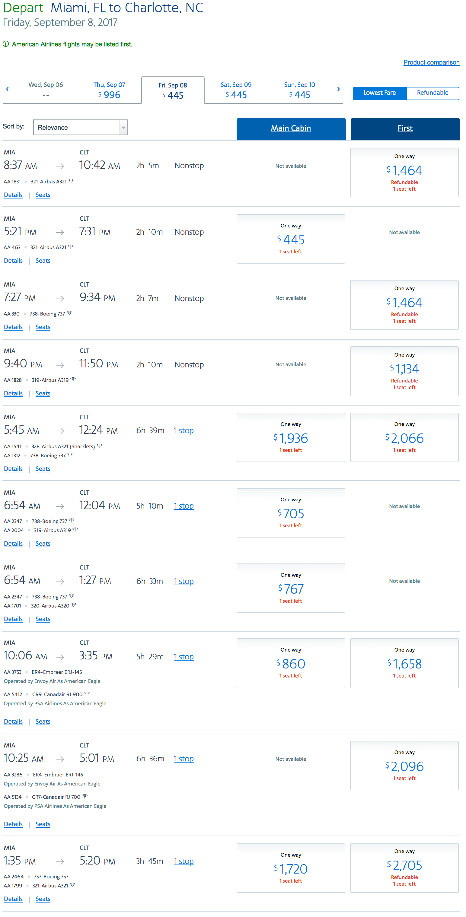 Cash prices for flights are high as seats are selling out quickly. For example, here's a screenshot of the results of a search for one-way flights from Miami (MIA) to Charlotte (CLT) on American on Friday, September 8.