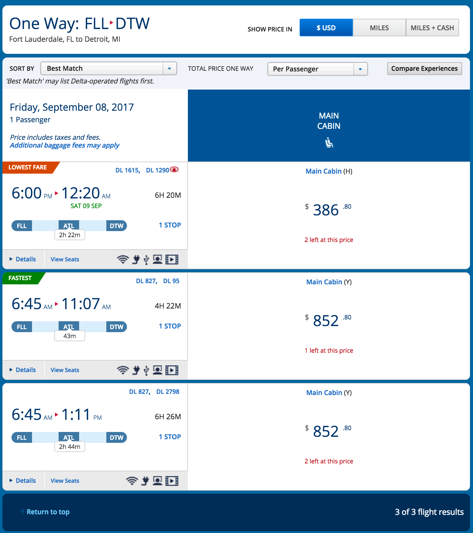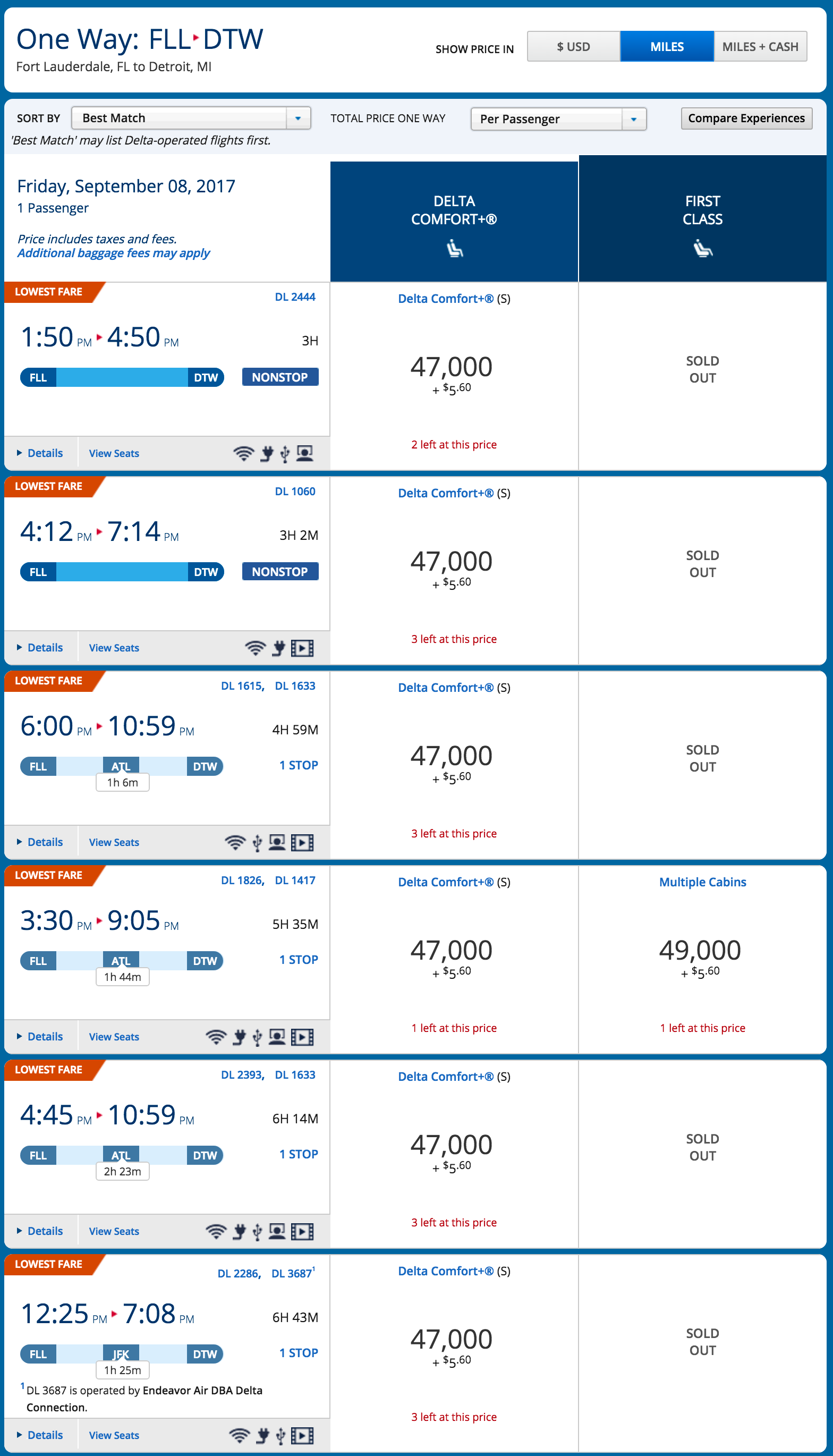 If you have a stash of Delta SkyMiles waiting to be burned, this could be a good opportunity to do so — though flights won't come cheap. The airline is charging 47,000 miles for the one-way flight from FLL to DTW.