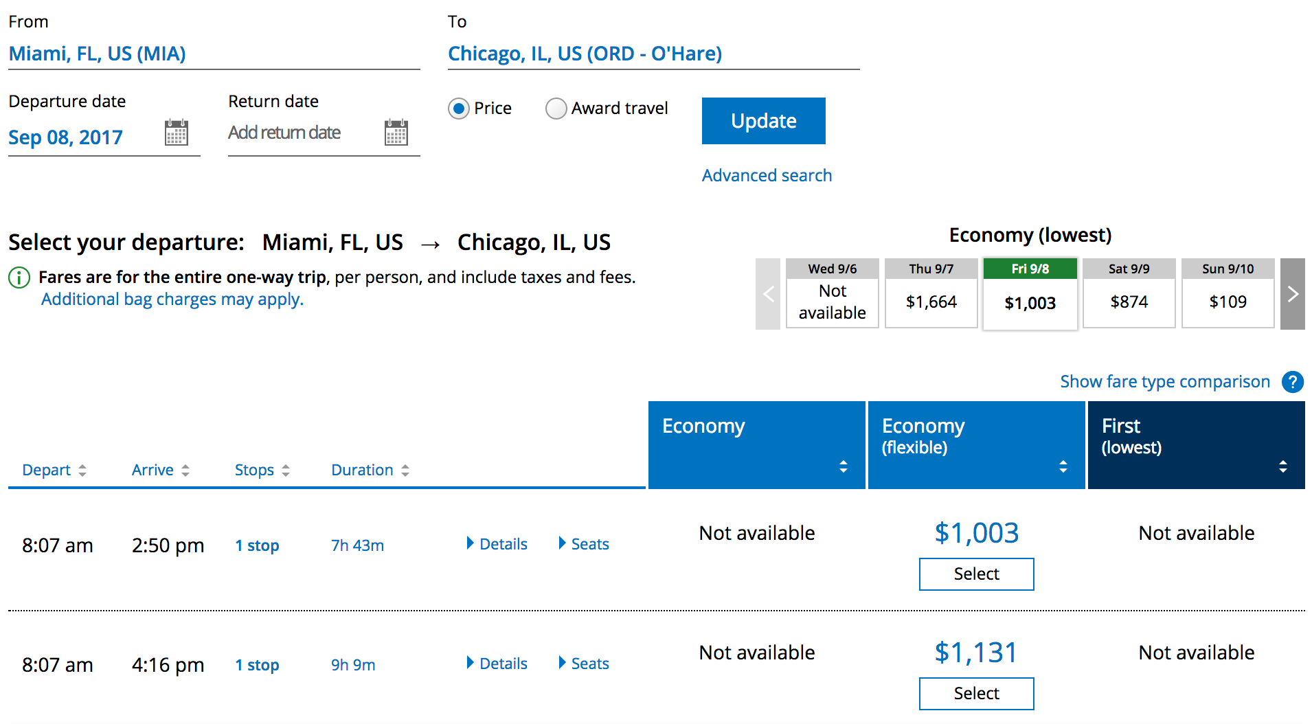 Finally, United's charging an eye-popping $1,003 for a one-way ticket from Miami (MIA) to its hub in Chicago (ORD).