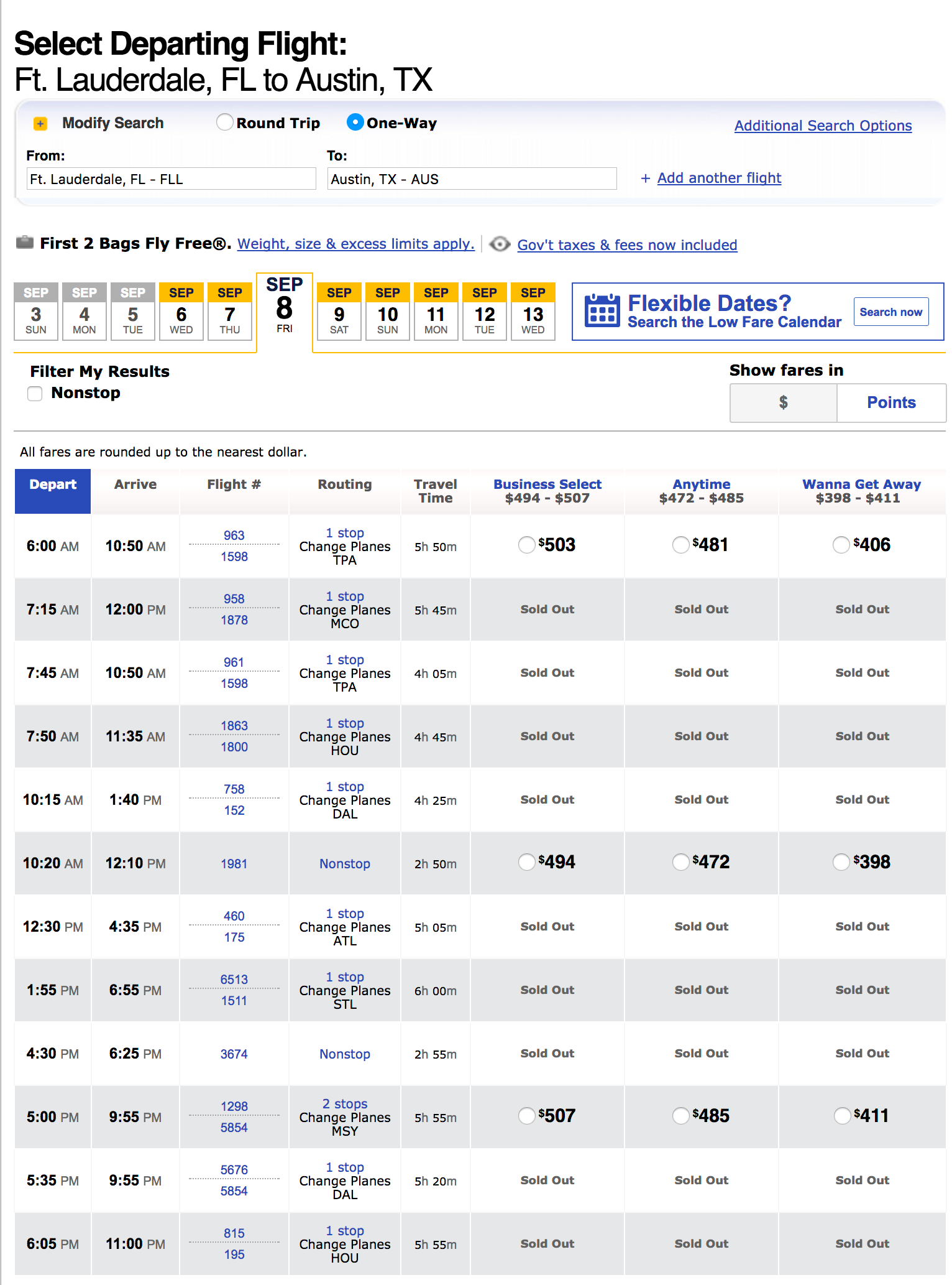 Southwest, on the other hand, still has some tickets available with prices that are much closer to Earth than those of its competitors — we're seeing one-way flights starting at under $400 from FLL to Austin (AUS). Plus, with Southwest's generous checked bag policy, it could be a great way to get out quick.